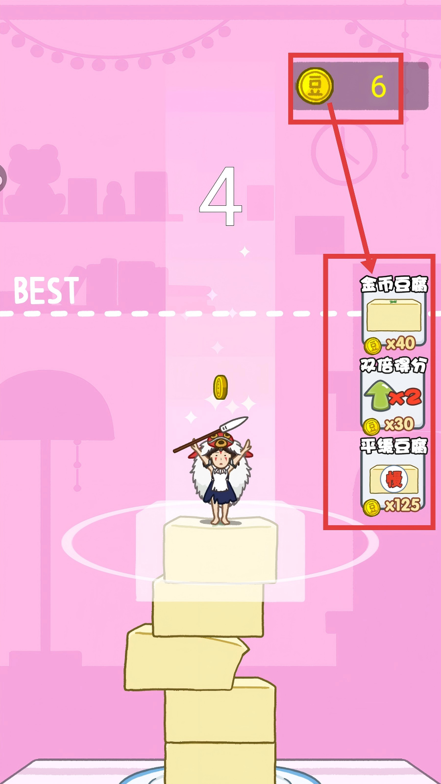 3、关注右侧的【金币豆腐】【双倍得分】等道具,收集它们能大幅增加金币数量,助力提升成绩。