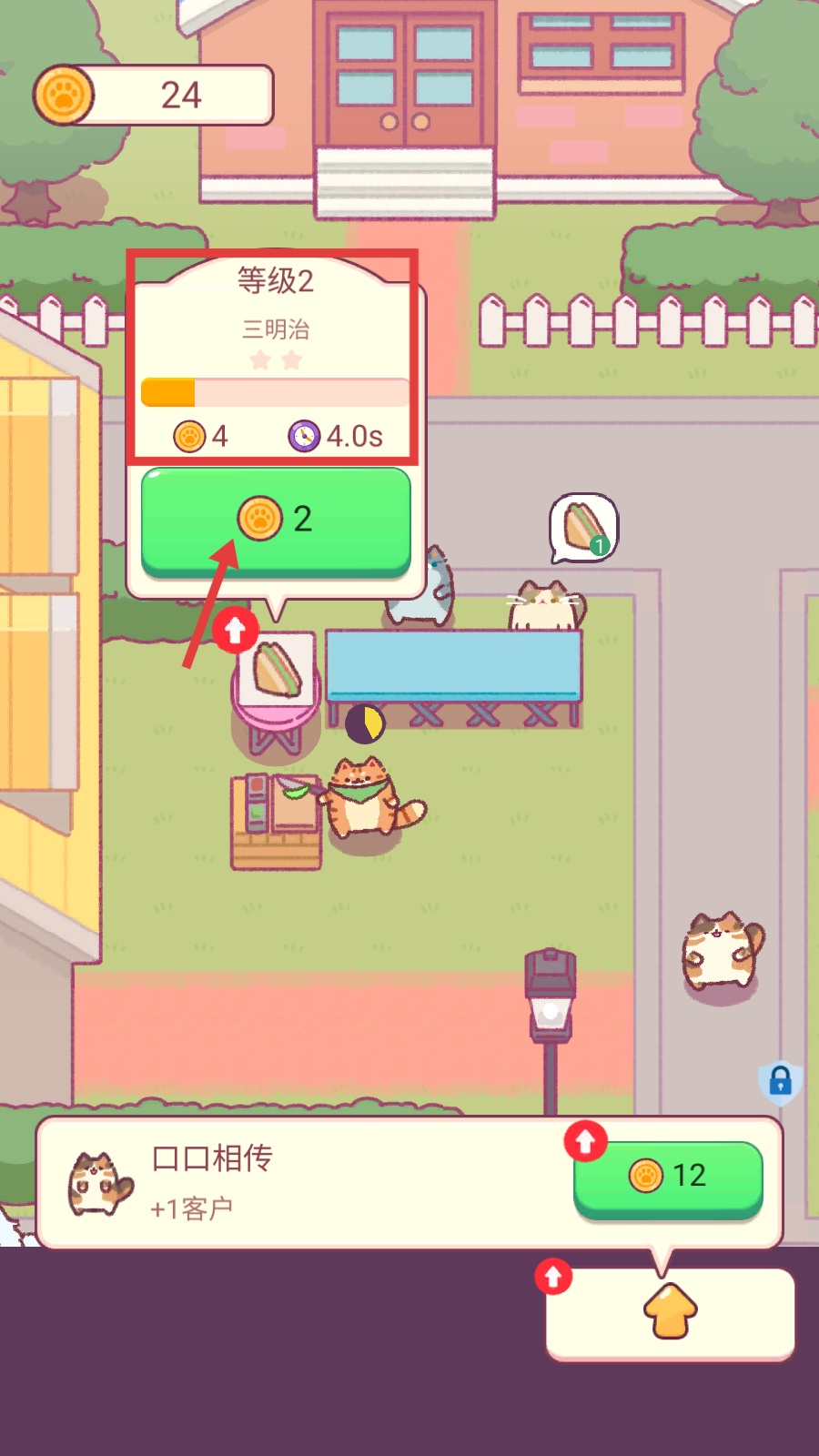 3、消耗少量金币升级三明治等级,如提升到【等级2三明治】,能增加单次制作的收益与效率。