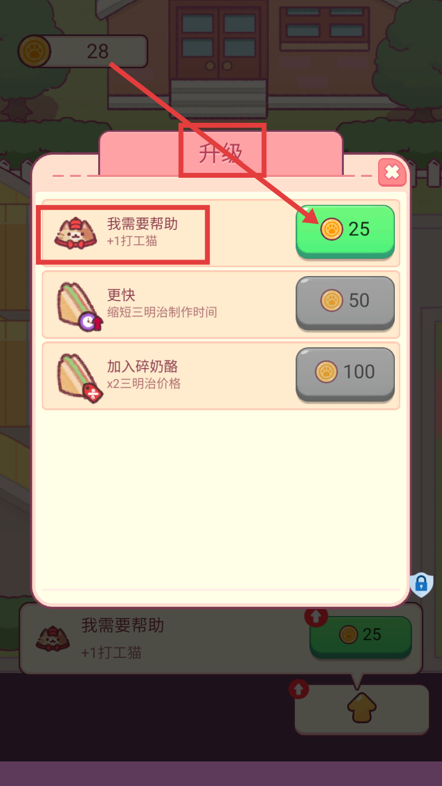 4、积攒足够金币后,在升级界面选择【我需要帮助】,消耗25金币可增加1只打工猫,助力店铺经营。