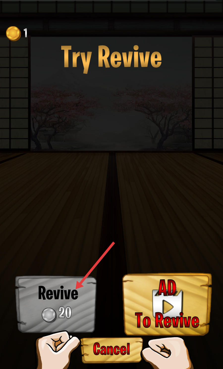 4、若游戏失败,可选择【Revive】消耗20道具复活,或看广告复活,也能点击【Cancel】放弃复活。