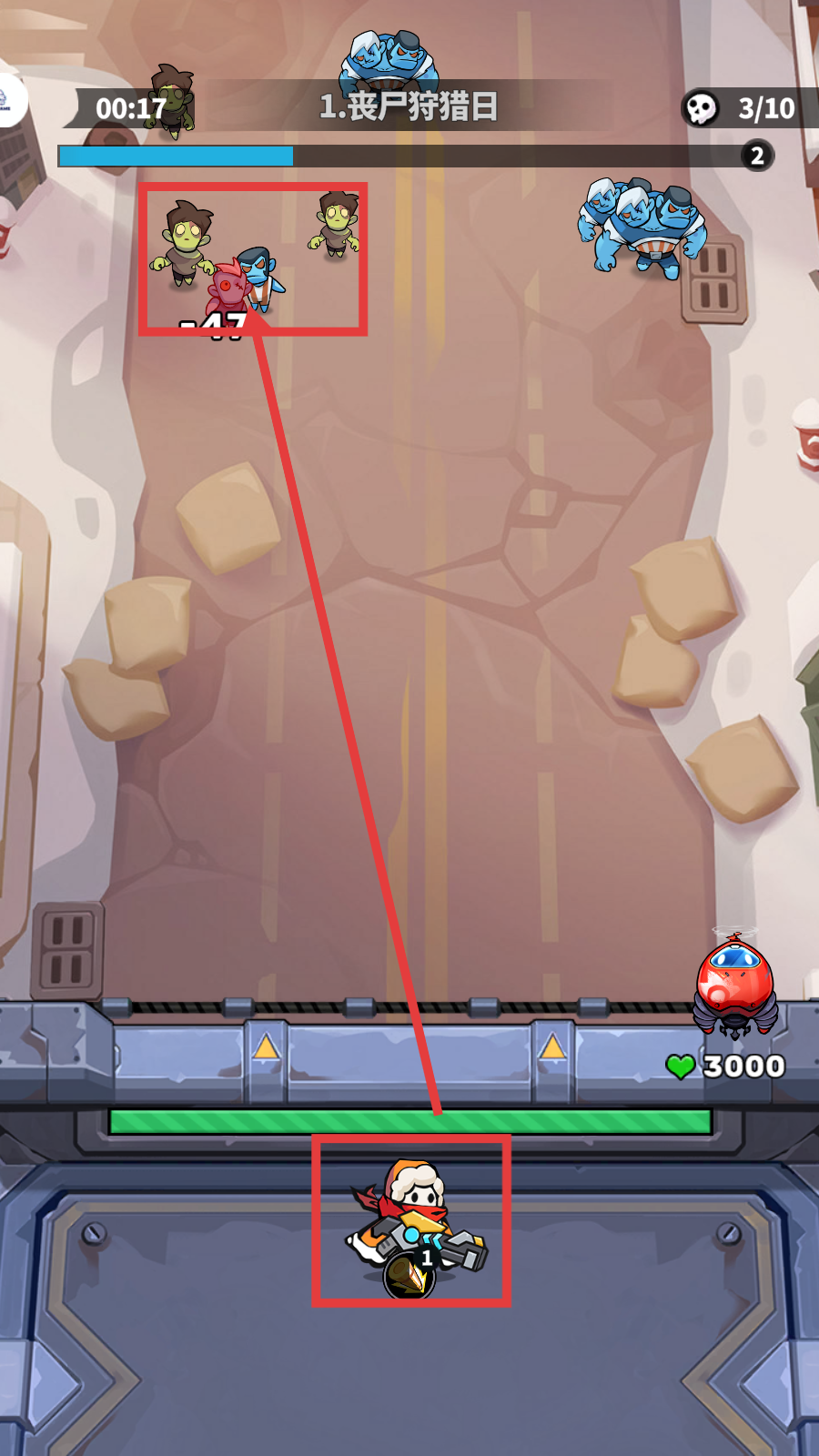 2、在【丧尸狩猎日】关卡中,操控角色瞄准丧尸进行射击,能对其造成伤害,同时注意躲避丧尸进攻,保护自身初始血量【3000】。