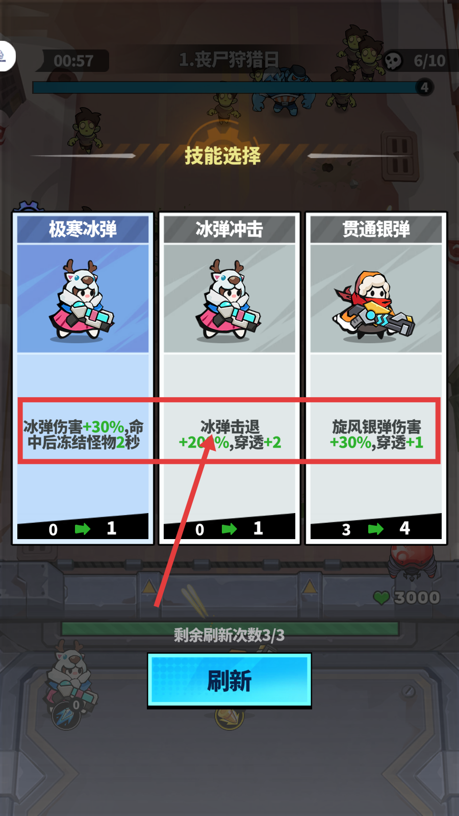 3、技能选择阶段,想控制敌人选【极寒冰弹】,想击退敌人选【冰弹冲击】,追求高伤害选【贯通银弹】,合理选择能提升战力。
