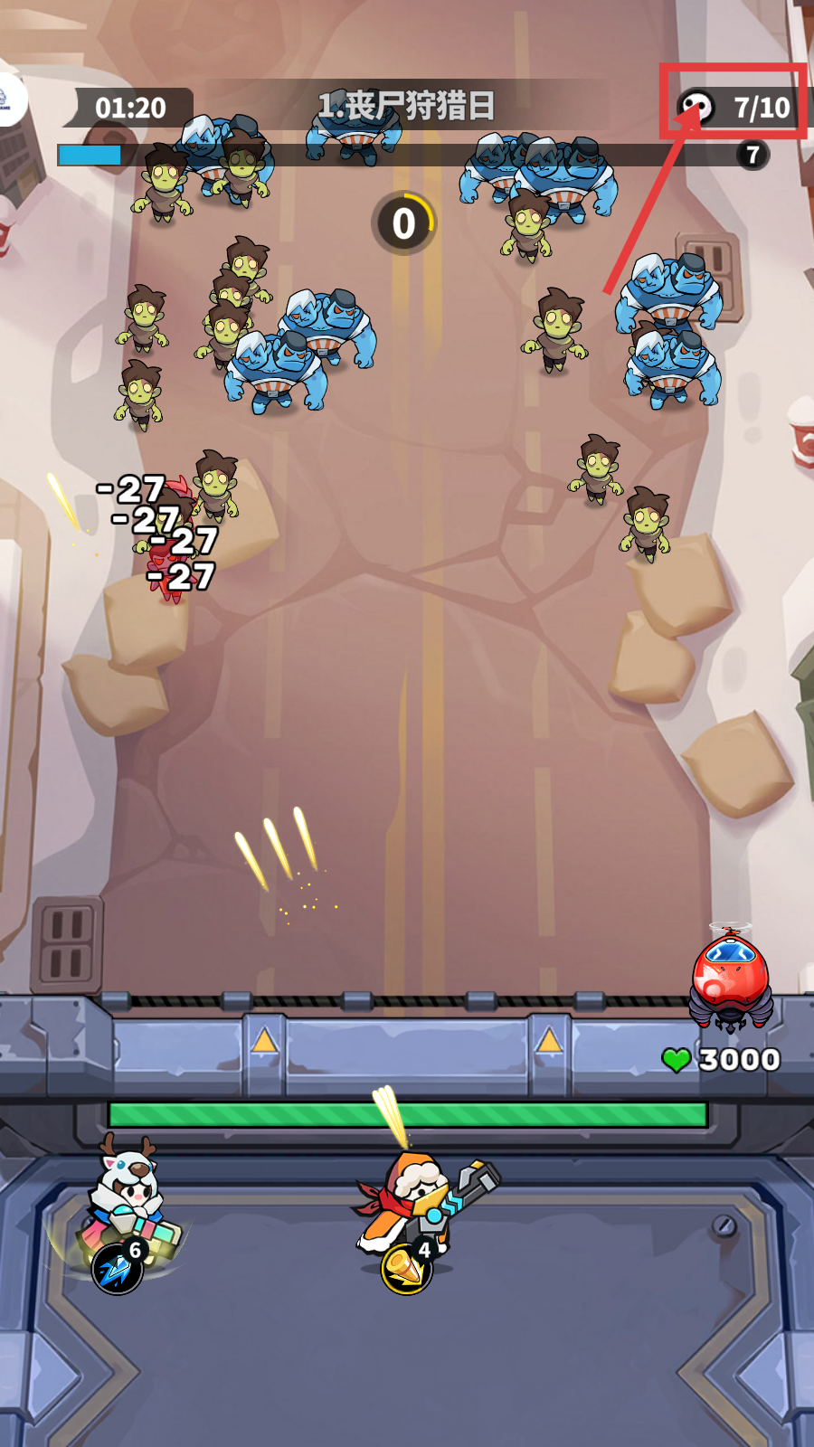 4、推进【丧尸狩猎日】关卡时,持续射击丧尸以积累击杀数,关注右上角击杀进度(如【7/10】),快速清理丧尸来推进关卡进度。