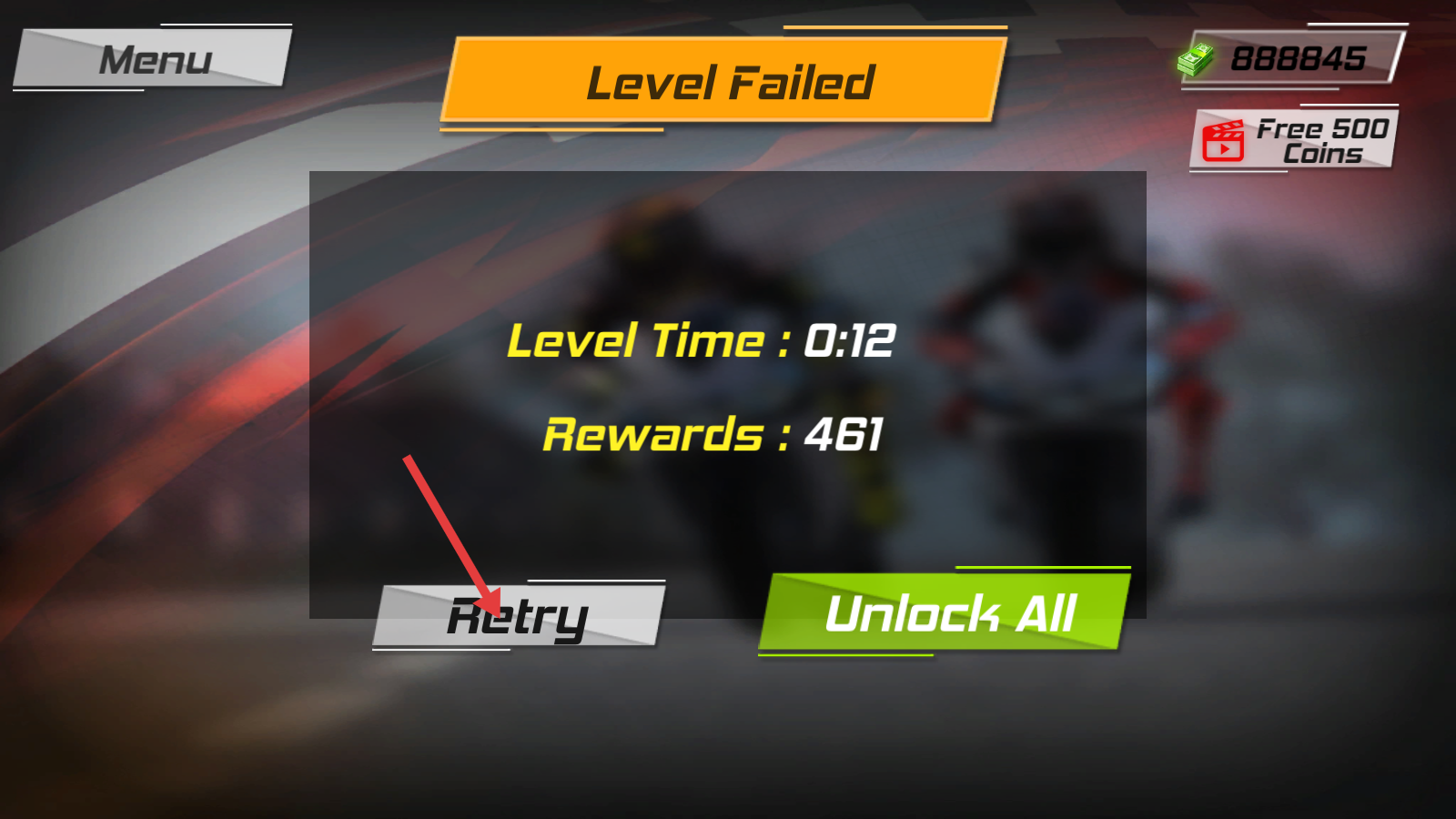 4、若出现【Level-Failed】的情况,点击【Retry】重新挑战关卡,多次尝试能积累经验并获取奖励。