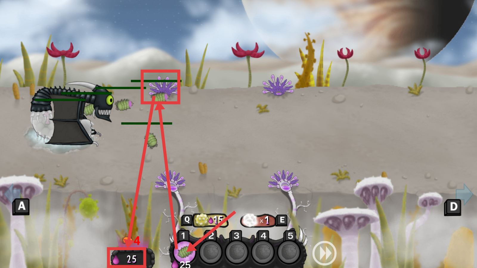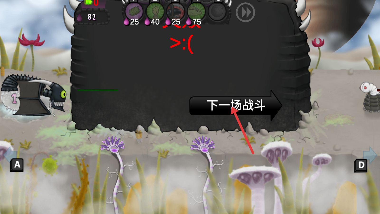 2、战斗中,消耗紫色资源(如界面显示的25点),点击下方单位图标(如带绿色虫形的格子),部署对应单位参战。