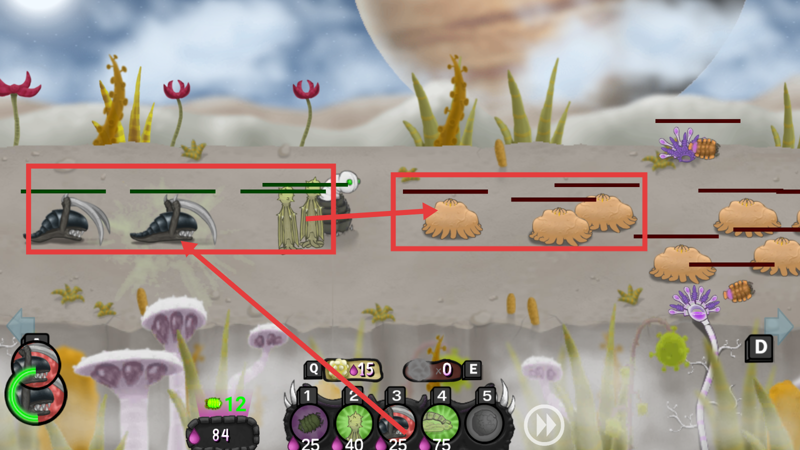 3、用部署的战斗单位(如带镰刀的黑色生物),攻击敌方棕色单位,灵活调配单位与资源,推进战线。