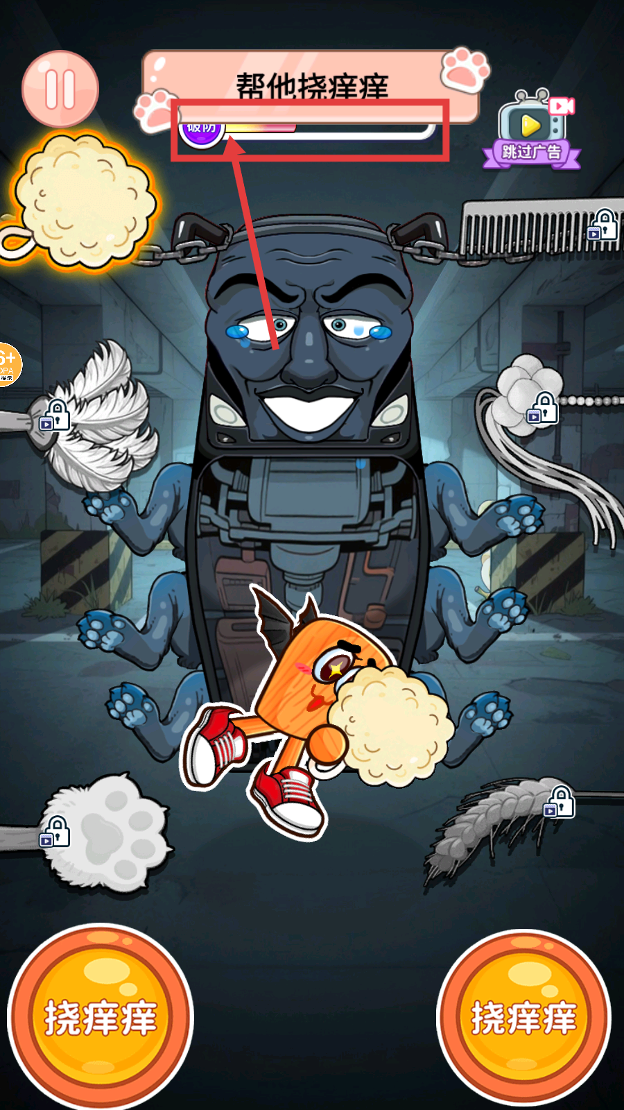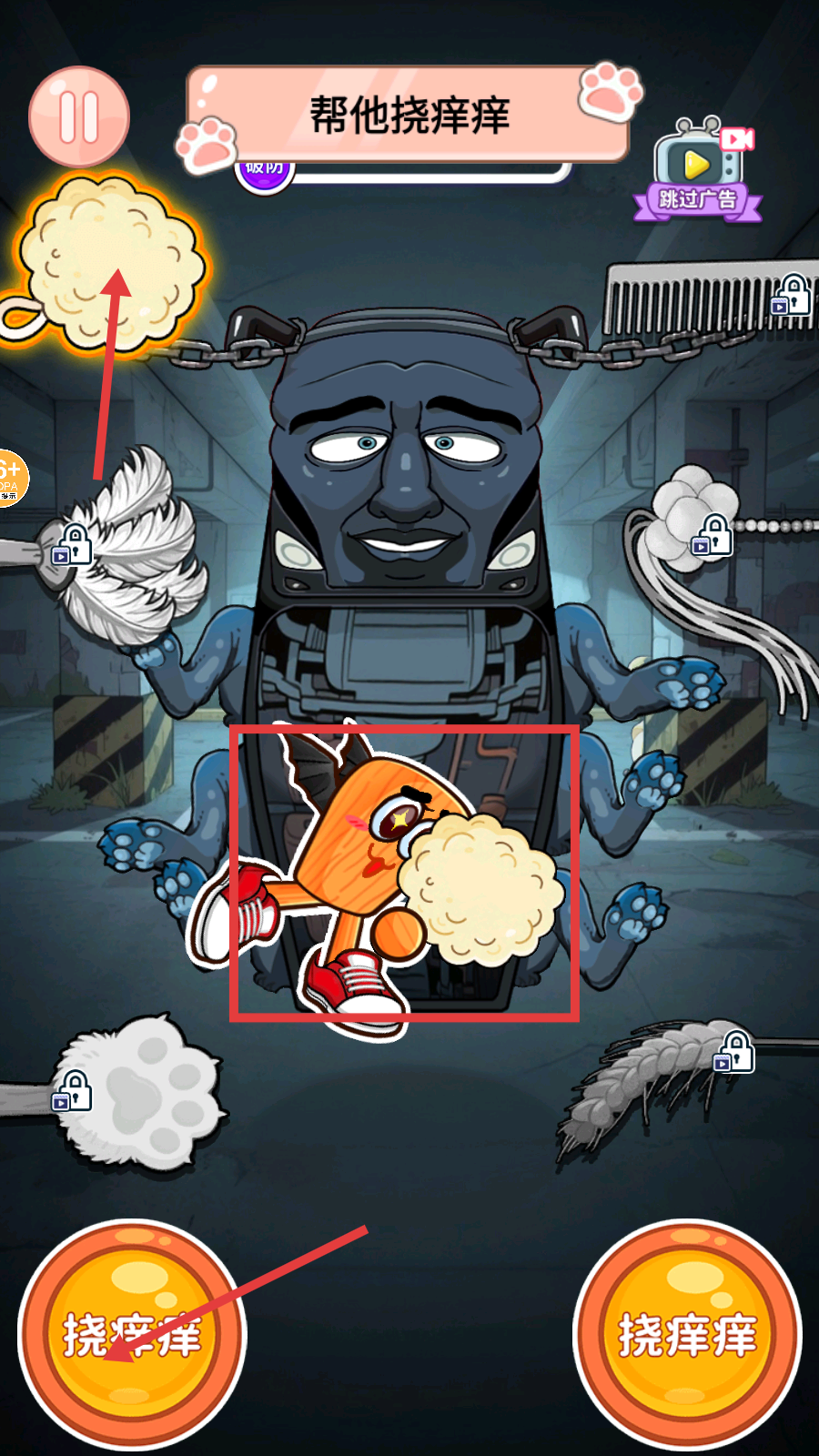 2、在“帮他挠痒痒”环节,使用解锁的道具(如带毛的工具),并点击下方【挠痒痒】按钮,触发互动效果。