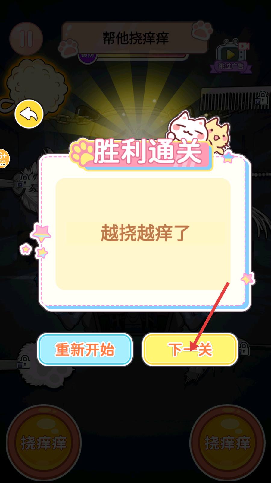4、成功让角色“越挠越痒”后,会显示【胜利通关】,此时点击【下一关】,可继续挑战后续关卡。