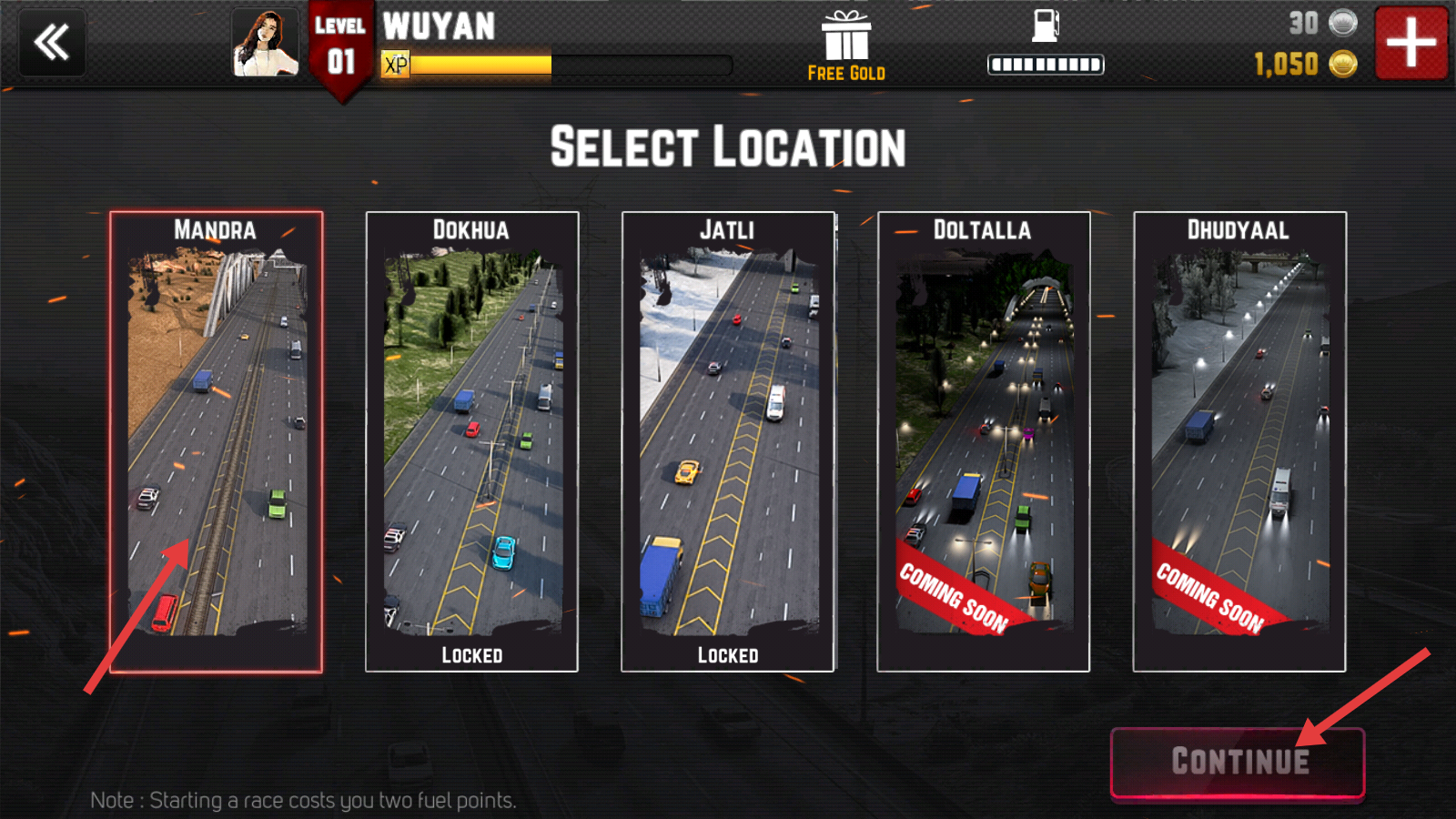 1、选关卡时,点击【MANDRA】赛道(其他如DOKHUA等为锁定状态),再点【CONTINUE】,消耗2点燃料开始比赛。