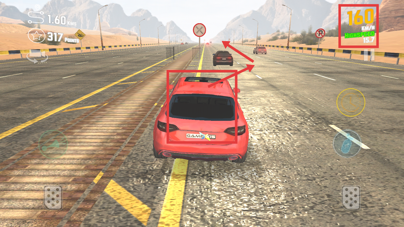 3、行驶中保持160KM/H左右的高速,避开前方车辆,同时留意路标,这样能获得更多积分和奖励。
