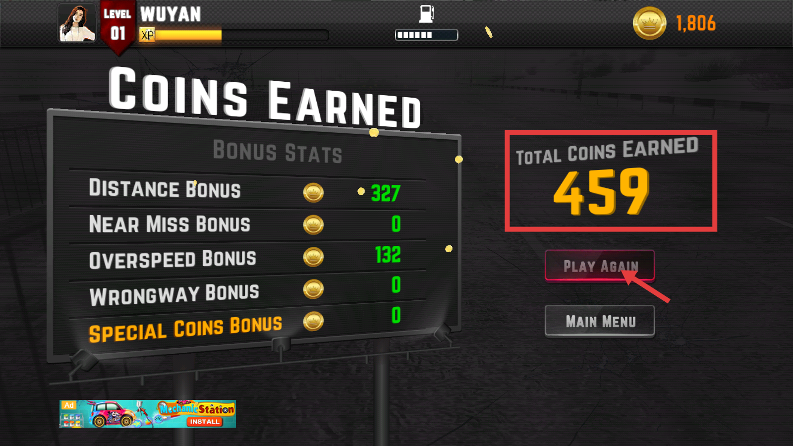 4、比赛结束后,可查看【TOTALCOINSEARNED】(总金币收益),若想再玩,点击【PLAYAGAIN】重新开始。