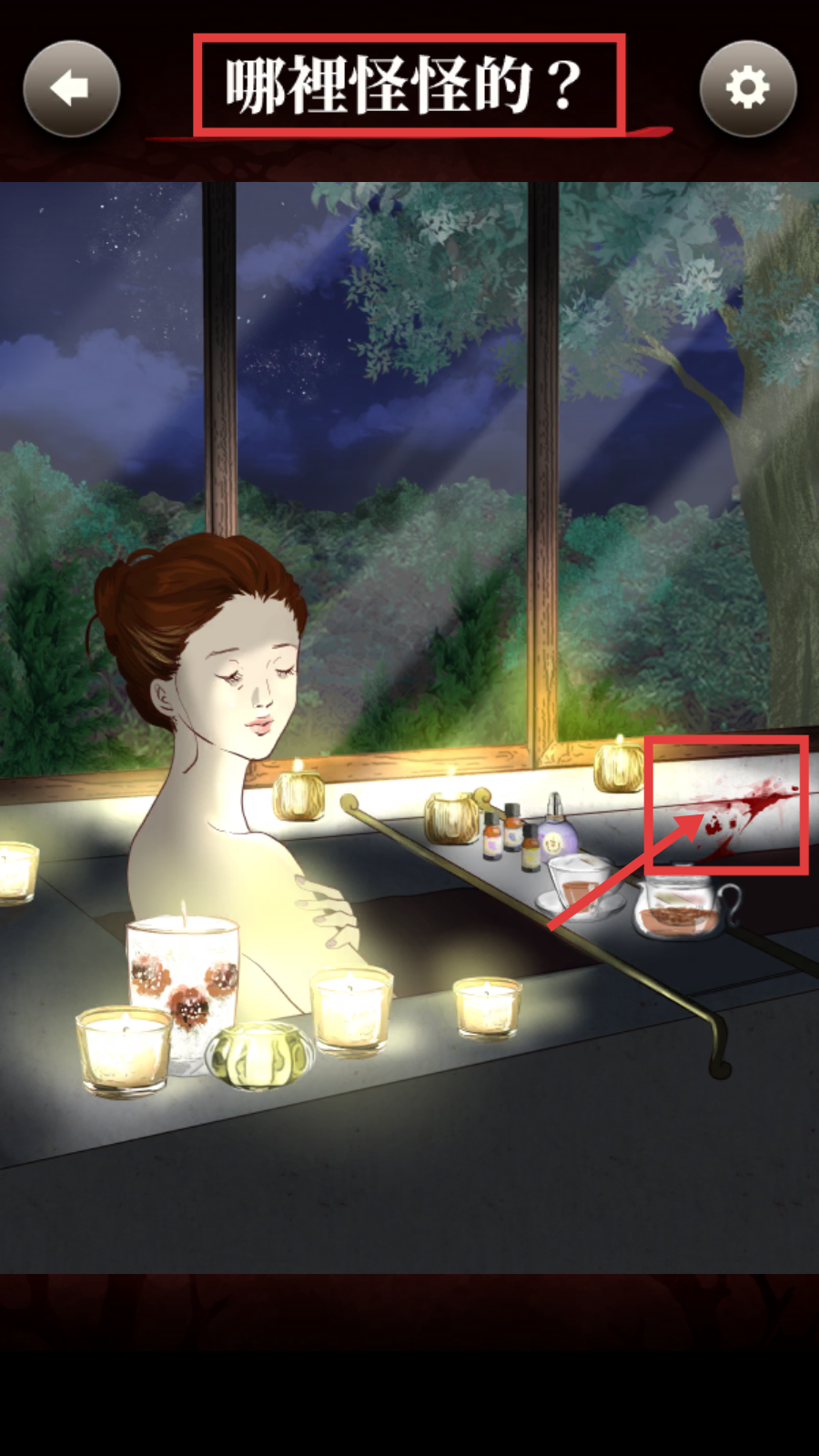 2、在浴室场景中,仔细查看画面元素,点击右侧带有血迹的区域,该区域是场景中“怪怪的”关键线索点。