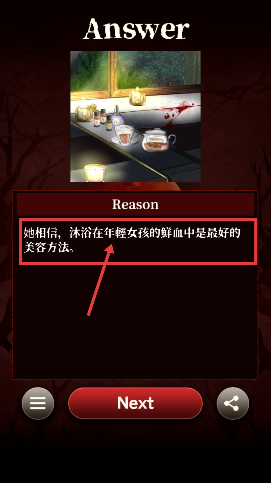 3、解谜后查看答案,得知【她相信,沐浴在年輕女孩的鮮血中是最好的美容方法】,理解场景异常背后的原因。