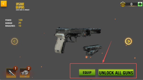 2、如何装备武器?在武器界面,点击“EQUIP”装备当前武器,或点击“UNLOCK ALL GUNS”解锁所有武器。