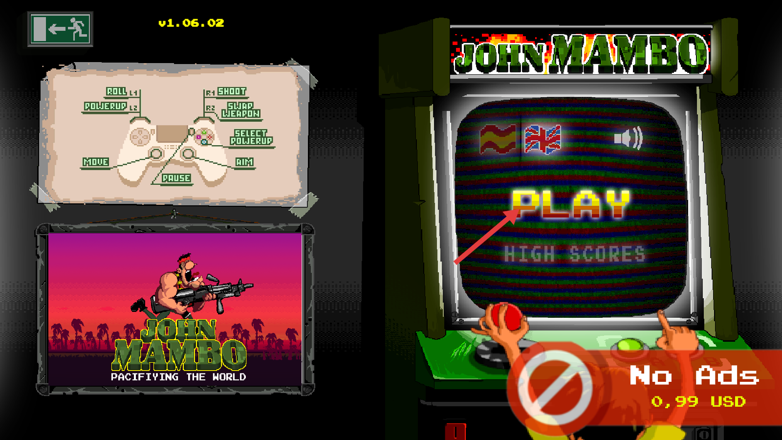 1、进入【John-Mambo】游戏,点击【PLAY】开始,先熟悉手柄操作提示,像【MOVE】【SHOOT】等功能,为后续战斗做准备。