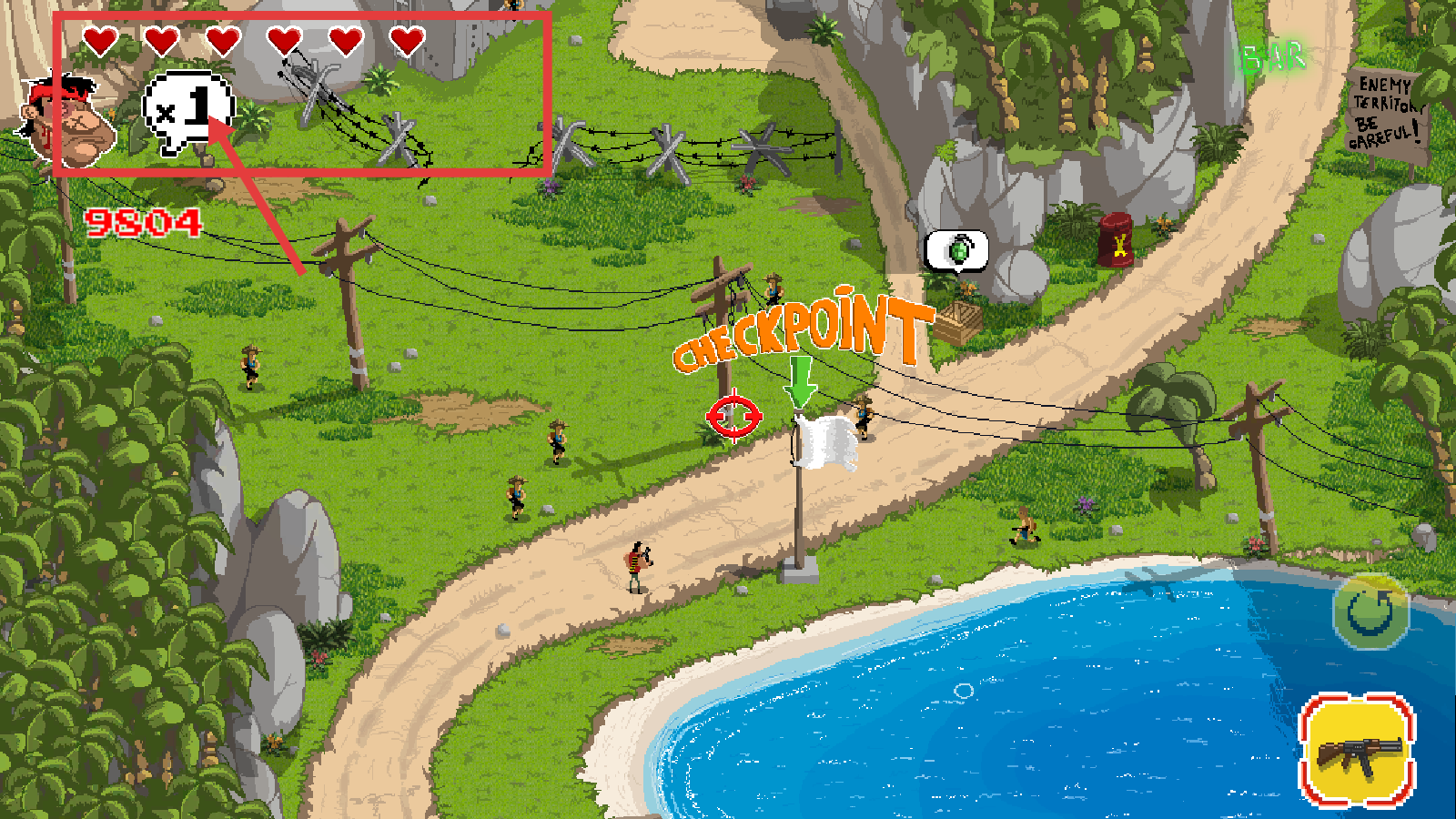 4、推进到【CHECKPOINT】处时,关注左上角的生命值(爱心图标),利用checkpoint保存进度,同时收集场景内的道具来增强战力。