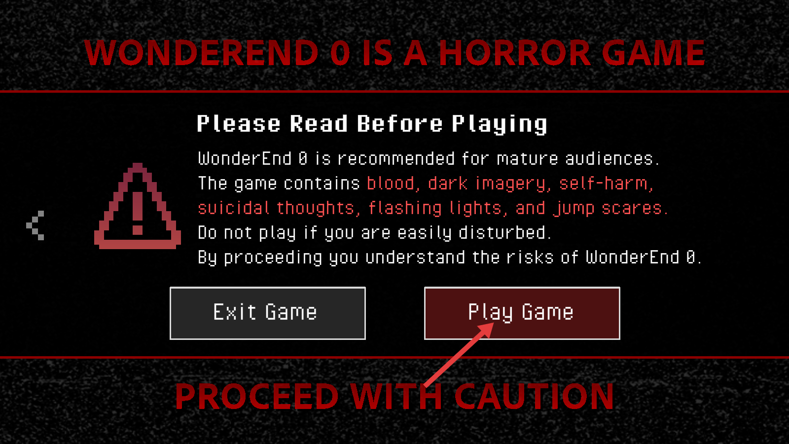 1、进入【WonderEnd0】前,留意它是恐怖游戏,含血腥、闪屏等元素,若易受干扰可选择【ExitGame】,否则点击【PlayGame】开始。