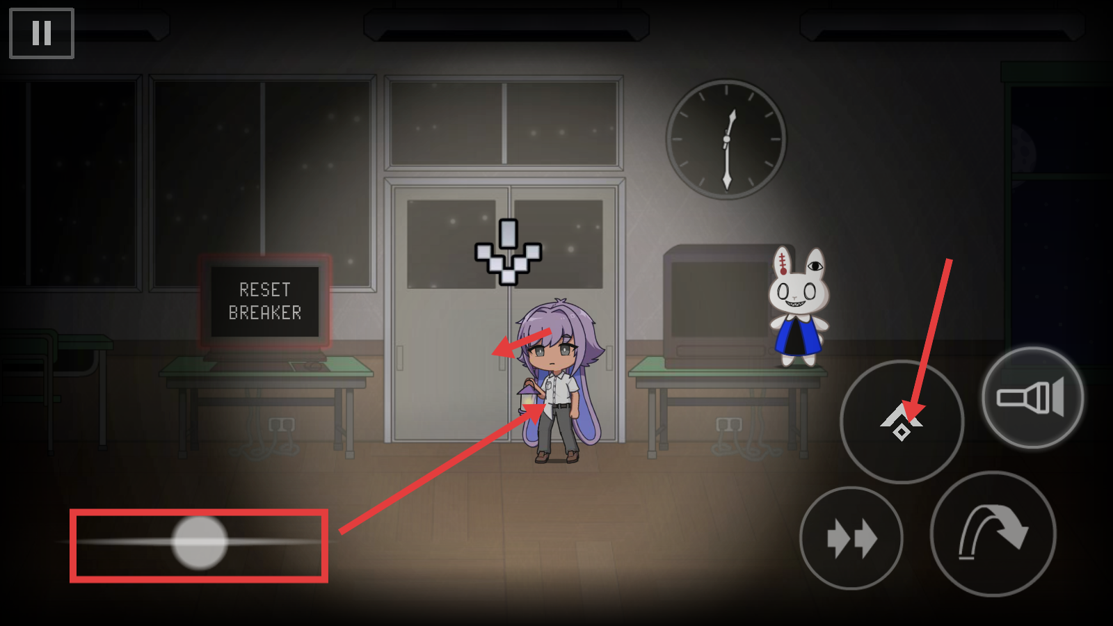 4、探索场景时,用右侧方向键操控角色移动,借助左侧进度条类元素推进,同时留意【RESETBREAKER】等场景互动点,探索新区域。