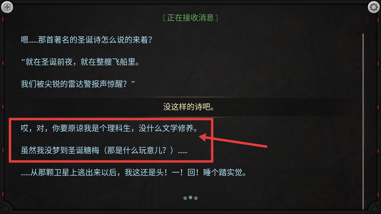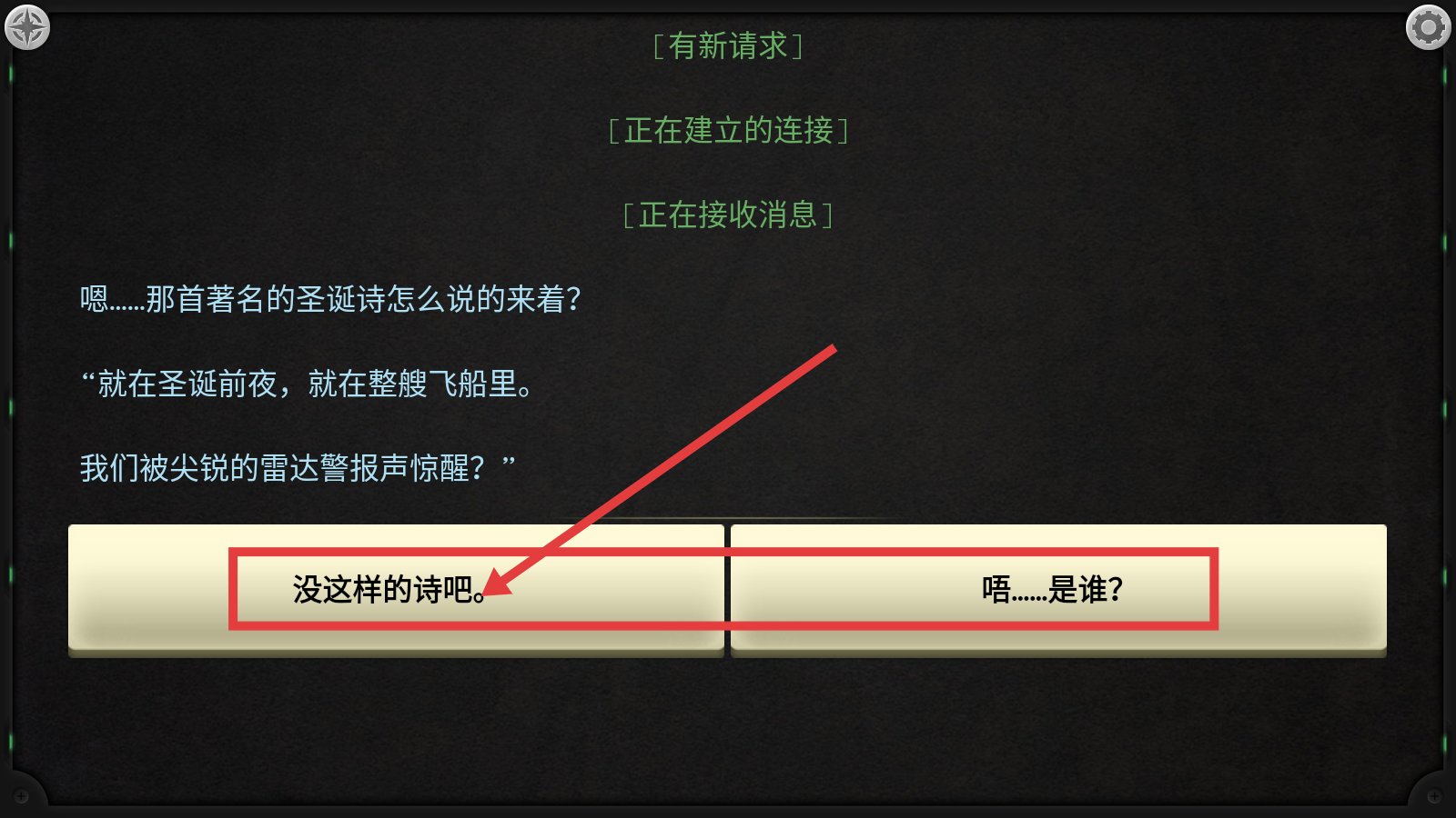 1、面对“那首著名的圣诞诗”相关提问,选择【没这样的诗吧】,开启与对方的交流,推进剧情。