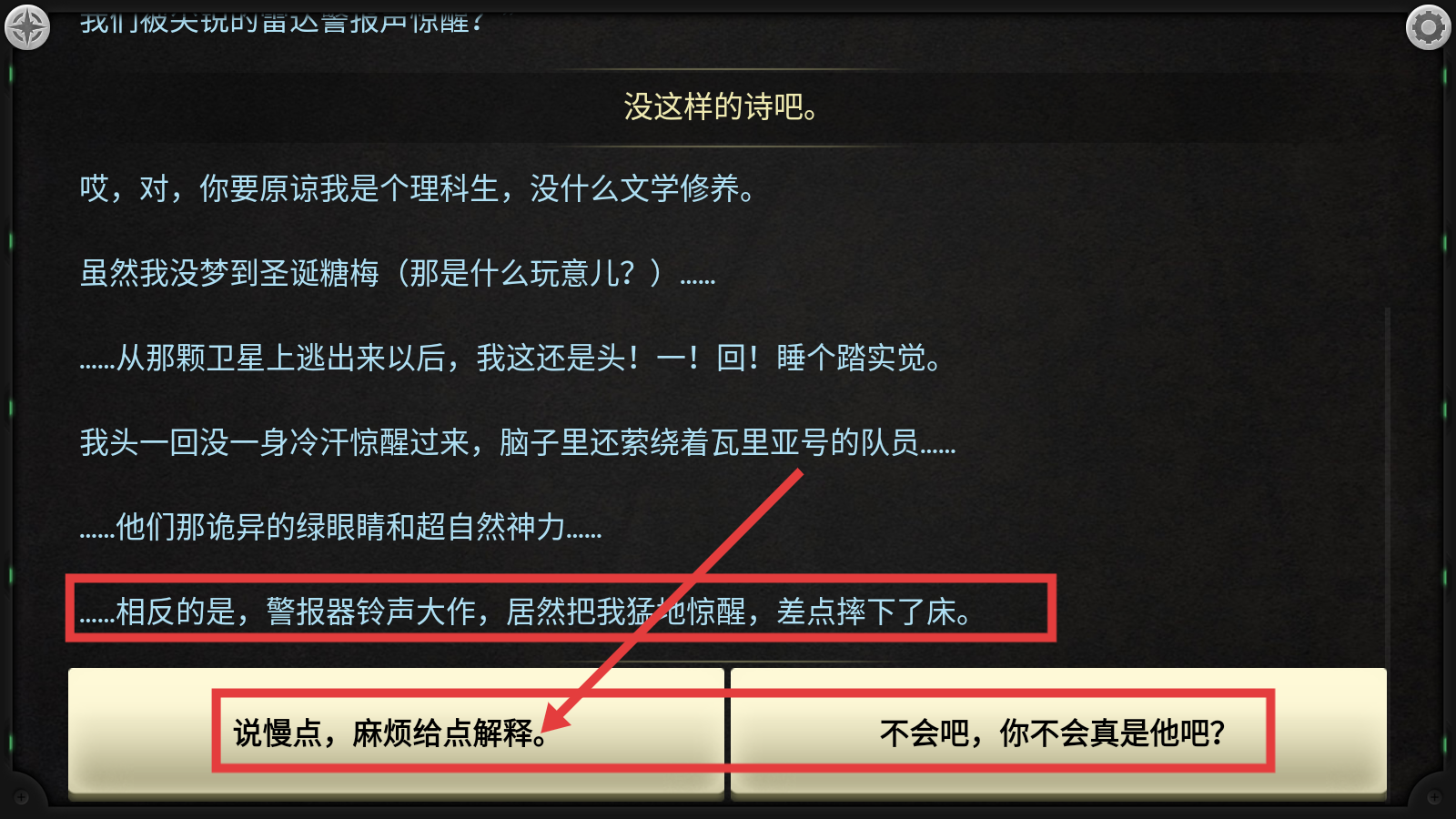 3、当看到“警报器铃声大作”等内容后,选择【说慢点,麻烦给点解释】,让对方详细说明,获取更多剧情。