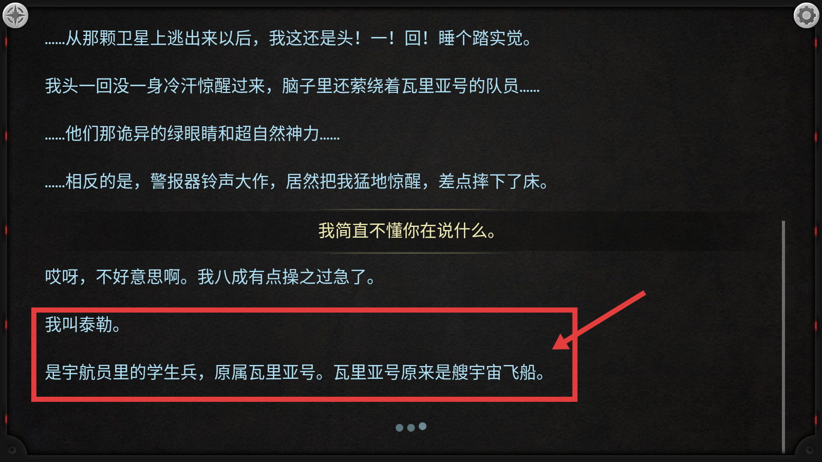 4、通过对话,得知对方叫泰勒,是瓦里亚号宇宙飞船的学生兵宇航员,了解其身份与飞船相关信息。