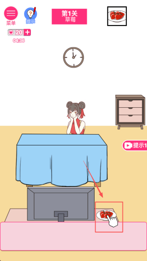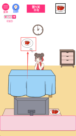 2、如何查看关卡信息?进入第1关后,可看到目标物品如“草莓”和奖励“Q20+”,以及剩余时间“04:48”。
