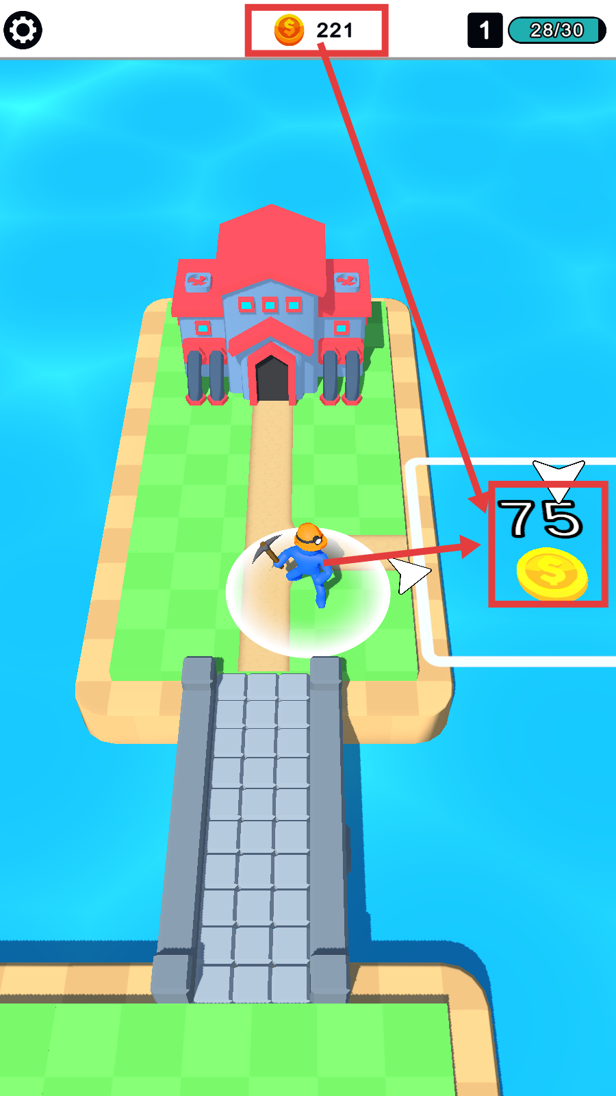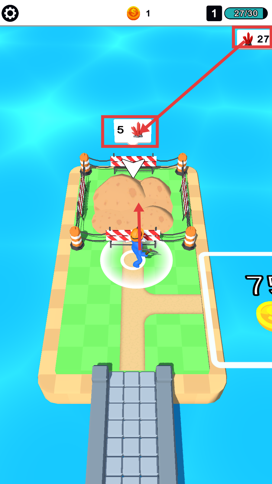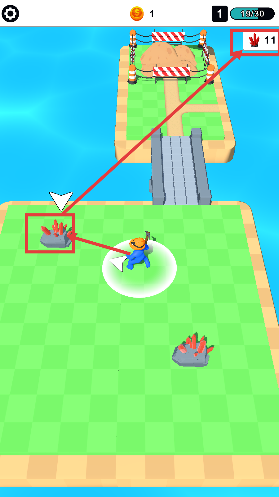 2、接着前往带障碍物的区域,采集土堆上的【5-红色晶体】,使总晶体数和关卡进度进一步提升。