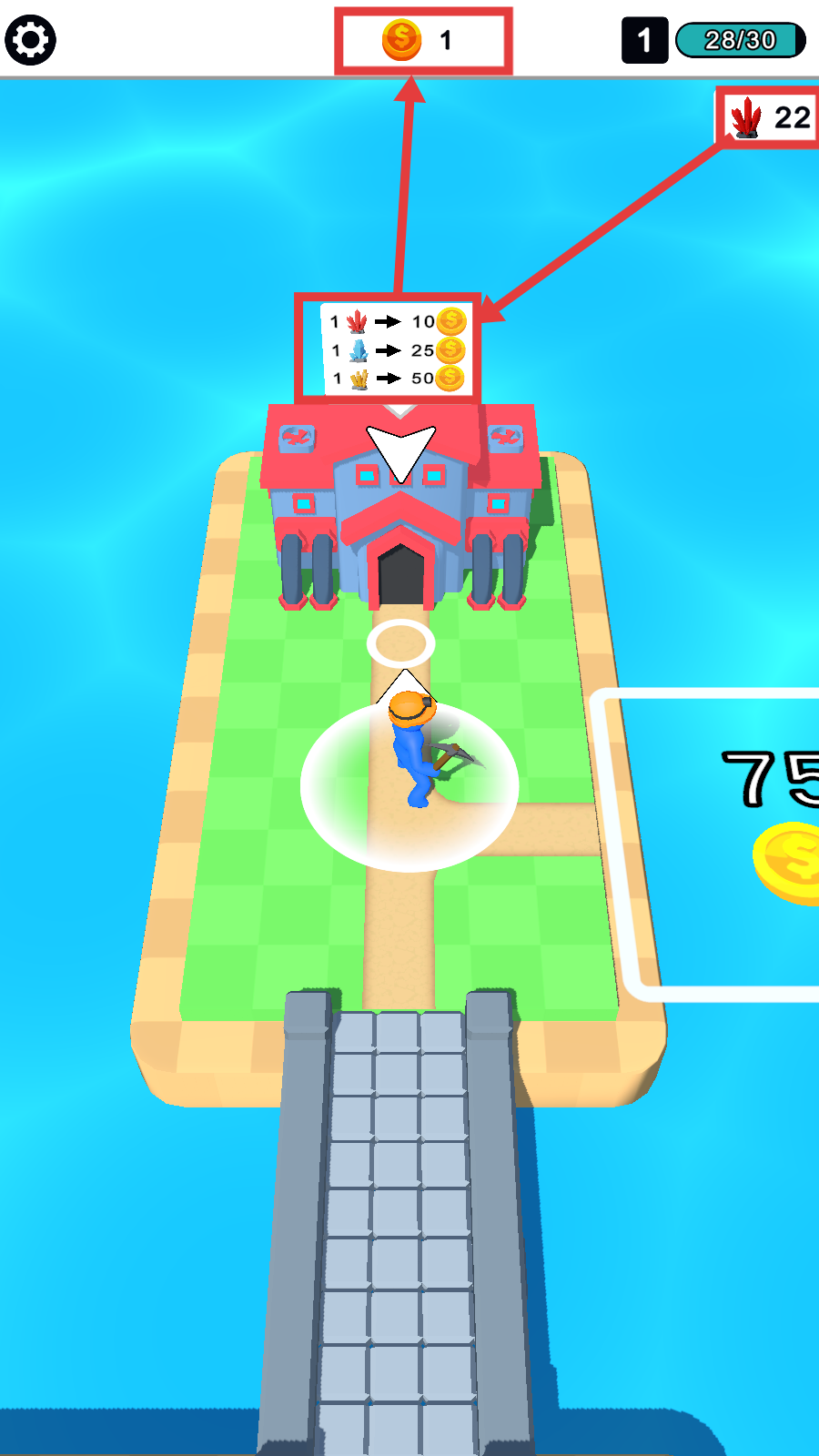 3、然后到建筑处,依据兑换规则【1-红色晶体→10-金币】,将收集的晶体兑换成金币,增加金币存量。