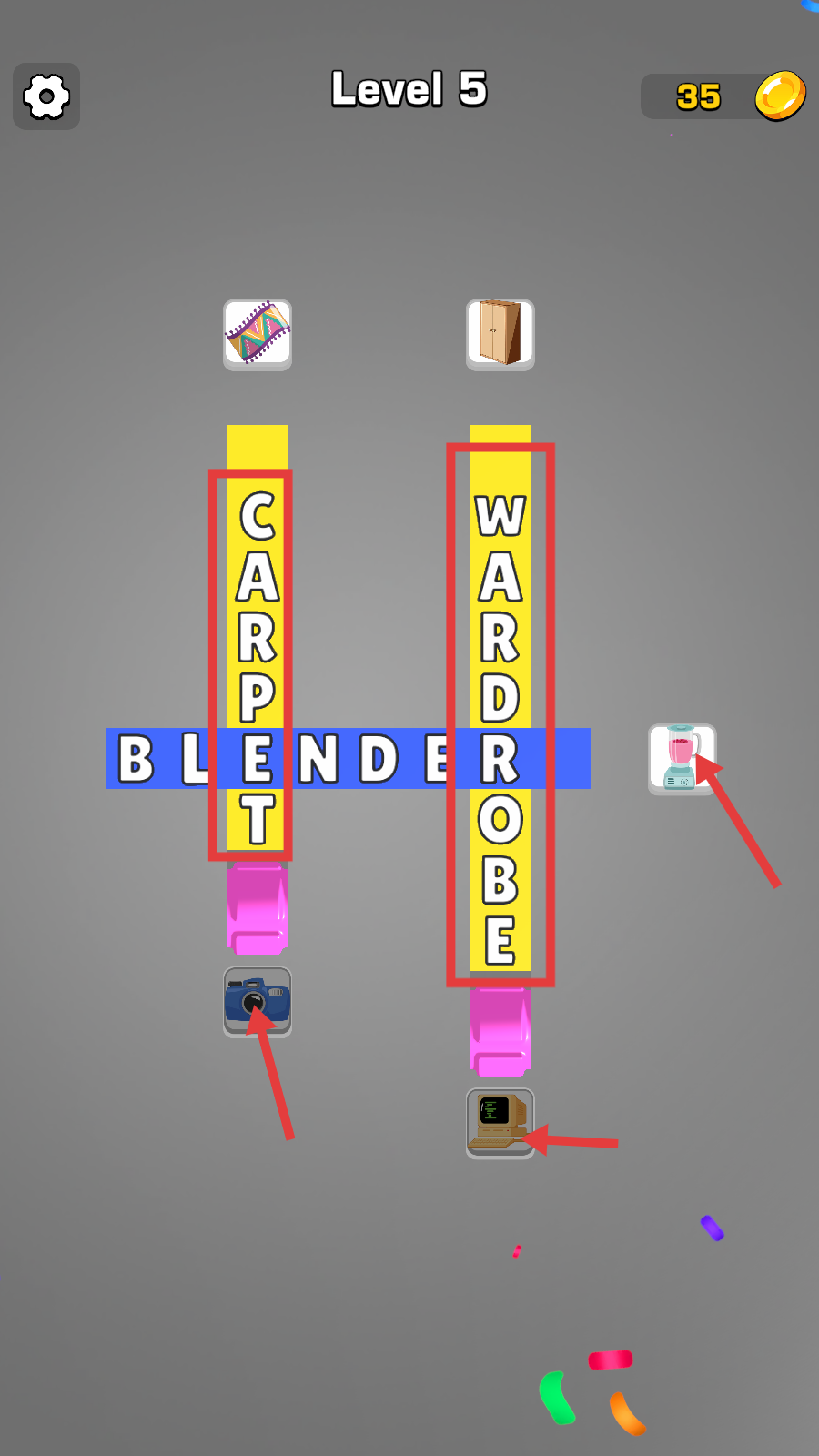 2、Level5时,依据【相机】【衣柜】【搅拌机】等物品,将字母组合成【CARPET】【WARDROBE】单词,正确拼写即可推进关卡。