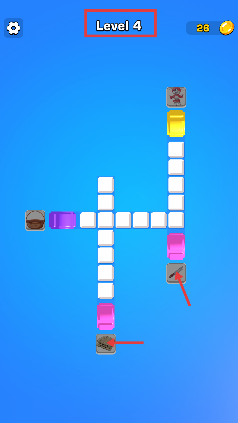 1、Level4关卡中,观察紫色、黄色、粉色方块与【篮子】【刀子】【布料】等物品,规划方块移动路径,为拼写单词铺垫。