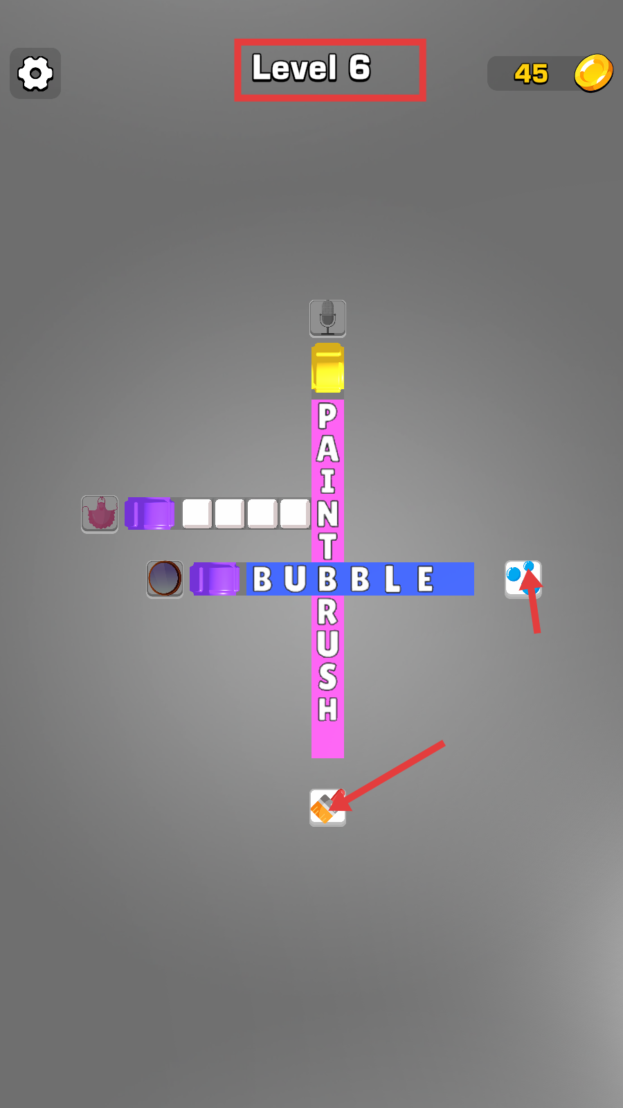 3、Level6需结合【颜料】【刷子】【泡泡】等物品图标,拼写【PAINTRUSH】【BUBBLE】单词,完成字母匹配来通关。