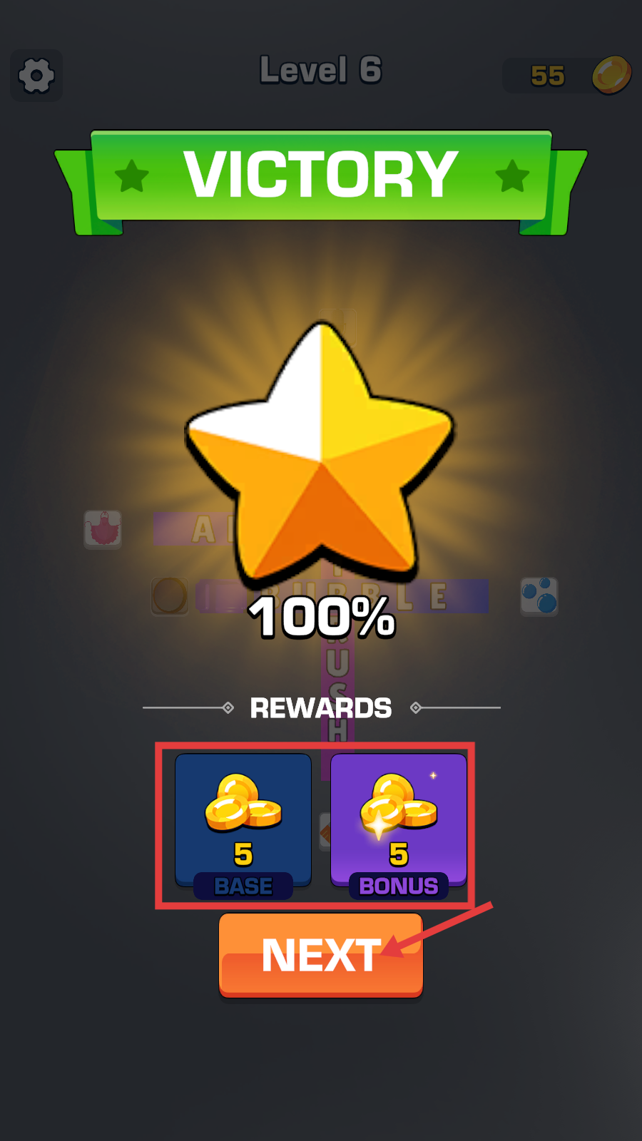 4、通关后会显示【VICTORY】,获得【5-BASE】金币和【5-BONUS】金币,点击【NEXT】按钮可进入下一关继续挑战。