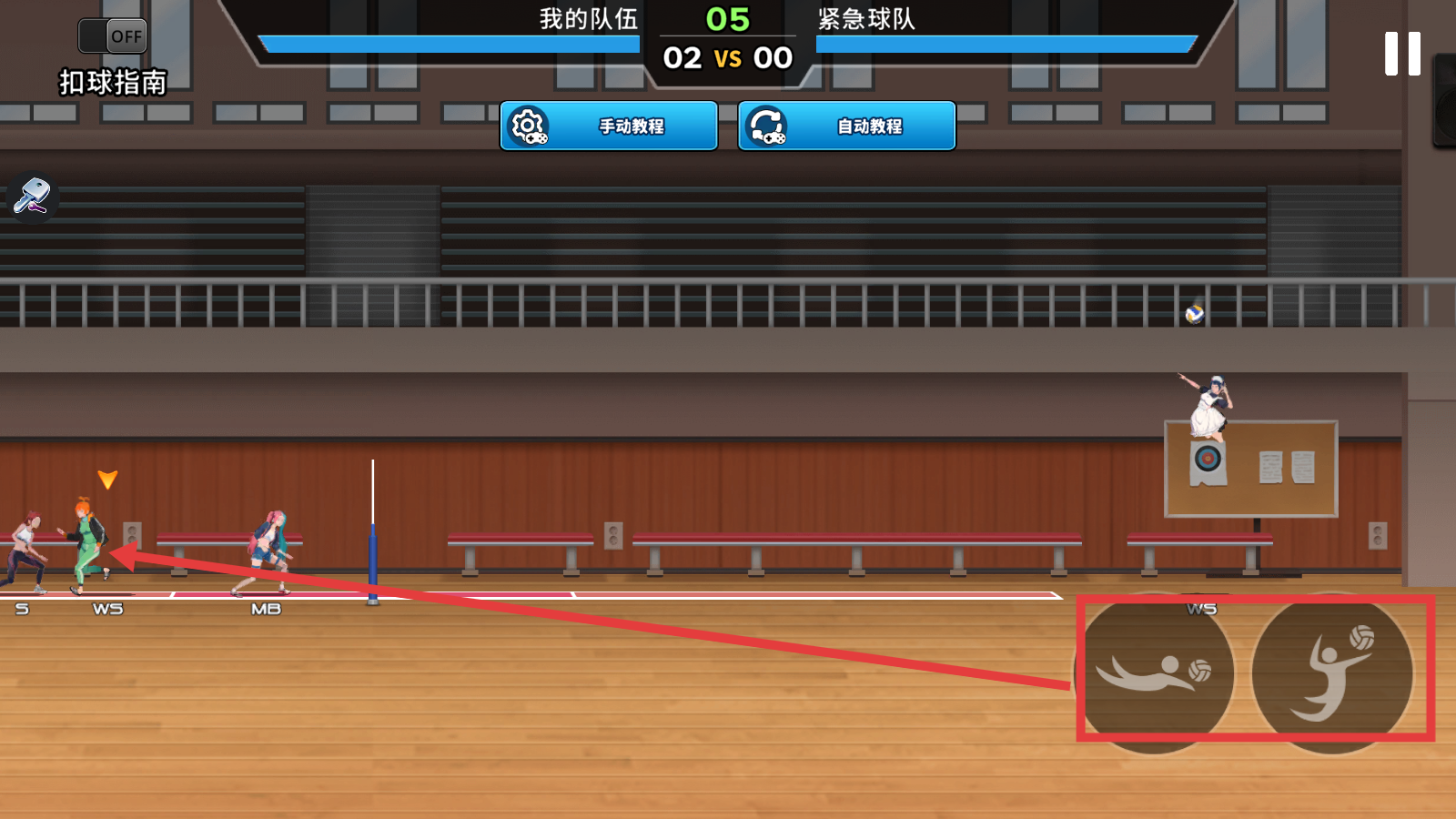 2、比赛时,操控球员(如WS位置球员)移动,注意右侧的移动和扣球类操作按钮,根据球的位置调整球员站位,准备接球或扣球。