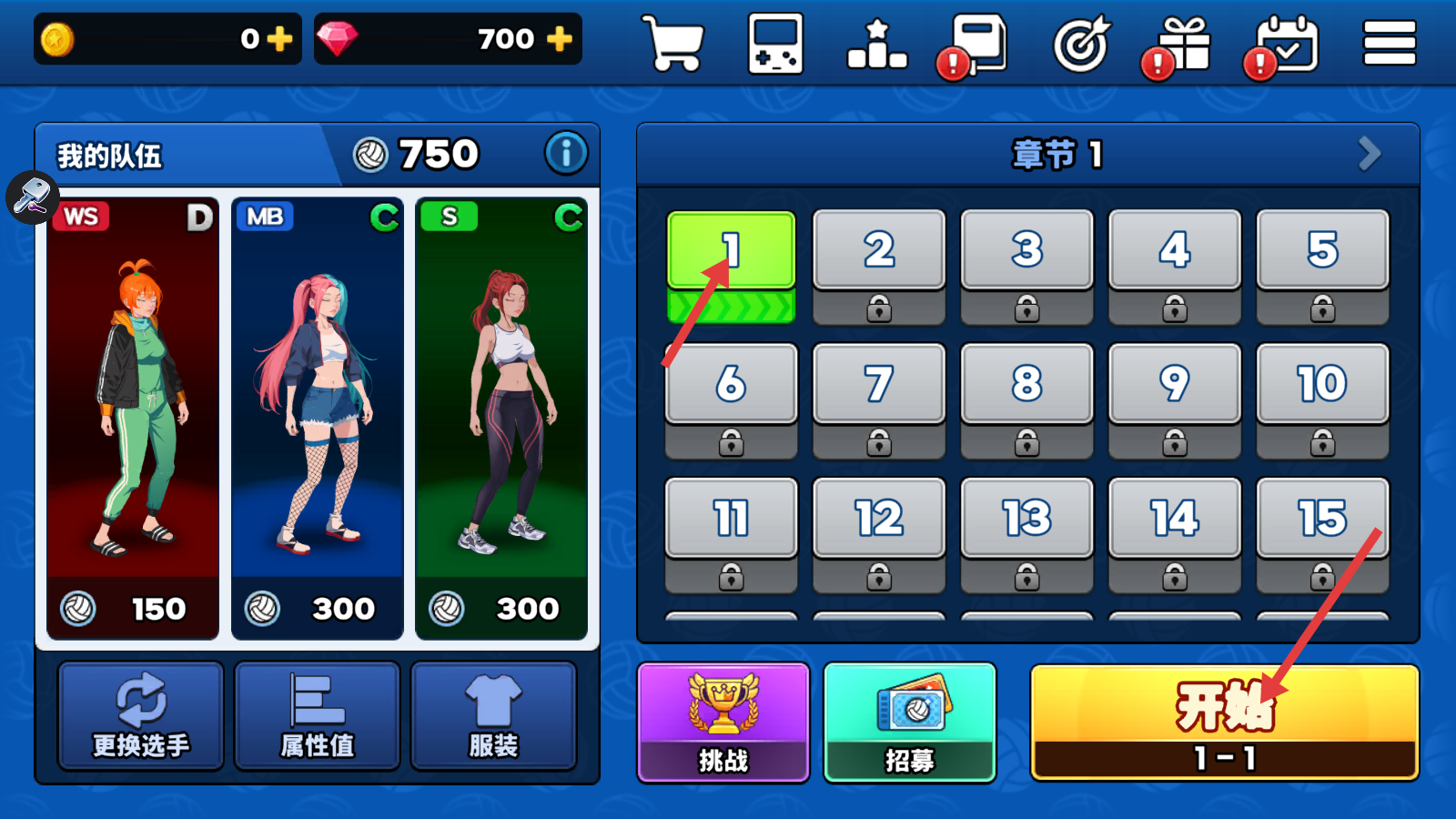 1、进入游戏后,先查看【我的队伍】成员属性,确认队伍总评【750】,然后选择【章节1-1】关卡,点击黄色【开始】按钮进入比赛。