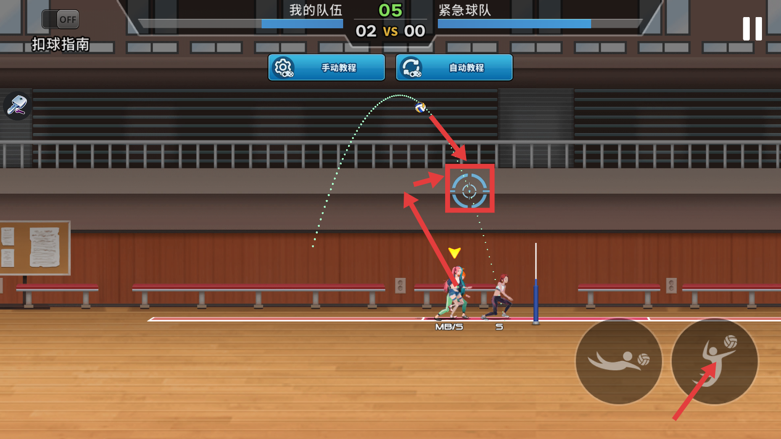 3、当进行扣球时,瞄准对方场地的目标区域(如出现的瞄准圈),点击扣球按钮,让球沿抛物线轨迹落到目标点,提升得分效率。