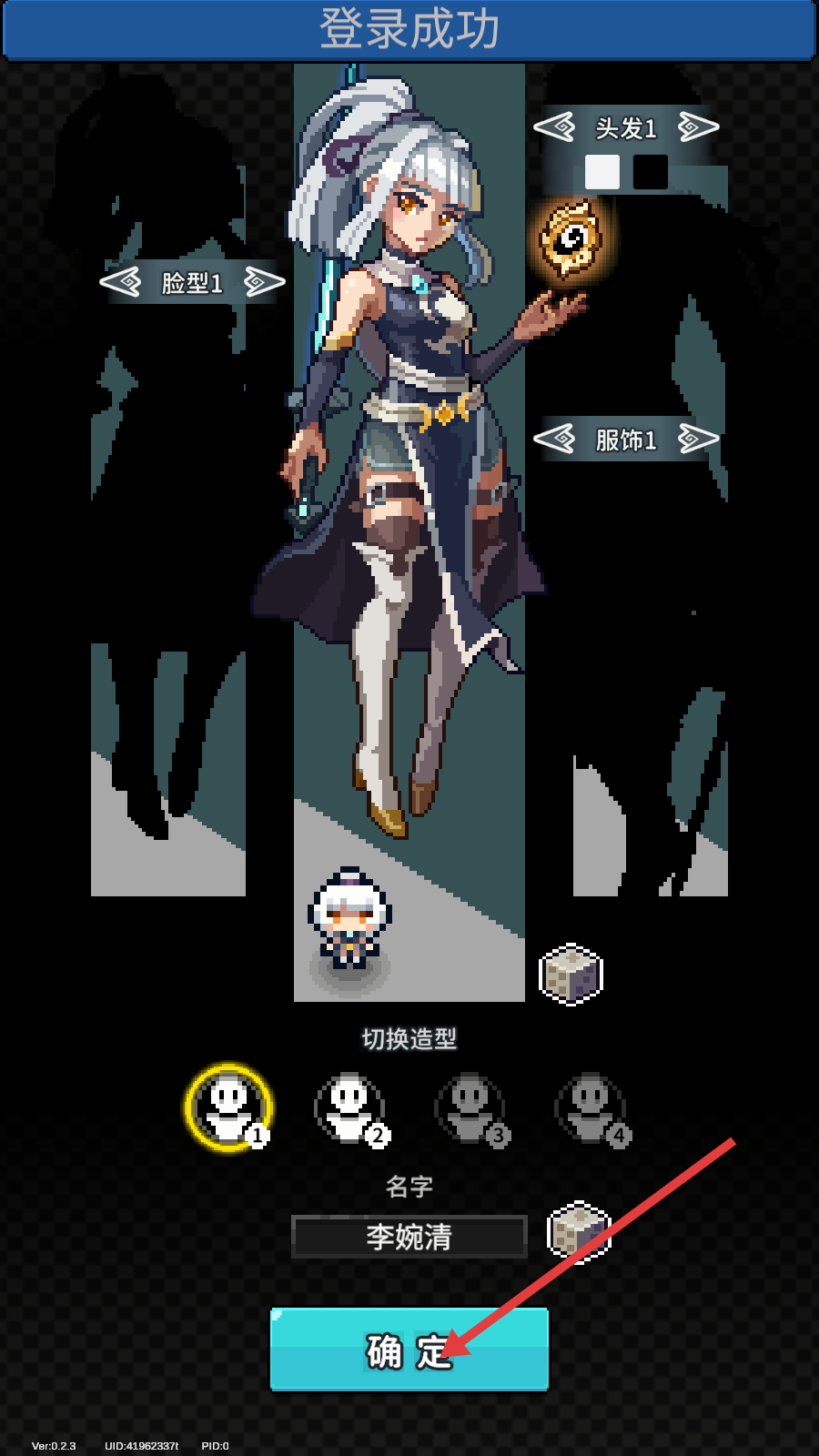 1、登录游戏后,在角色创建界面,可调整【头发1】【脸型1】【服饰1】等造型,确认名字后点击【确定】,进入游戏。