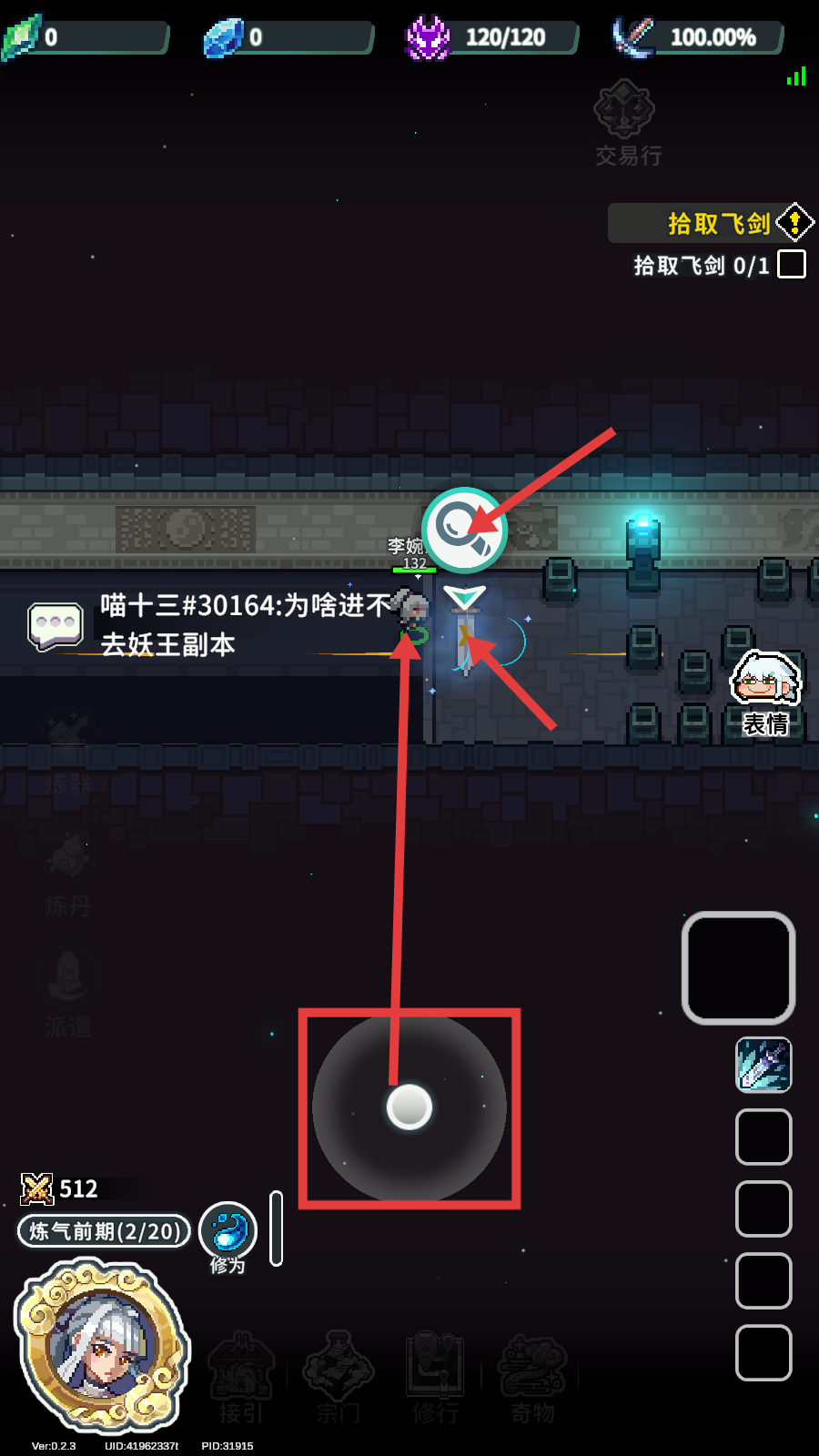 2、进入游戏场景后,操控虚拟摇杆移动角色,靠近飞剑时,通过交互按钮拾取飞剑,完成【拾取飞剑-0/1】任务。