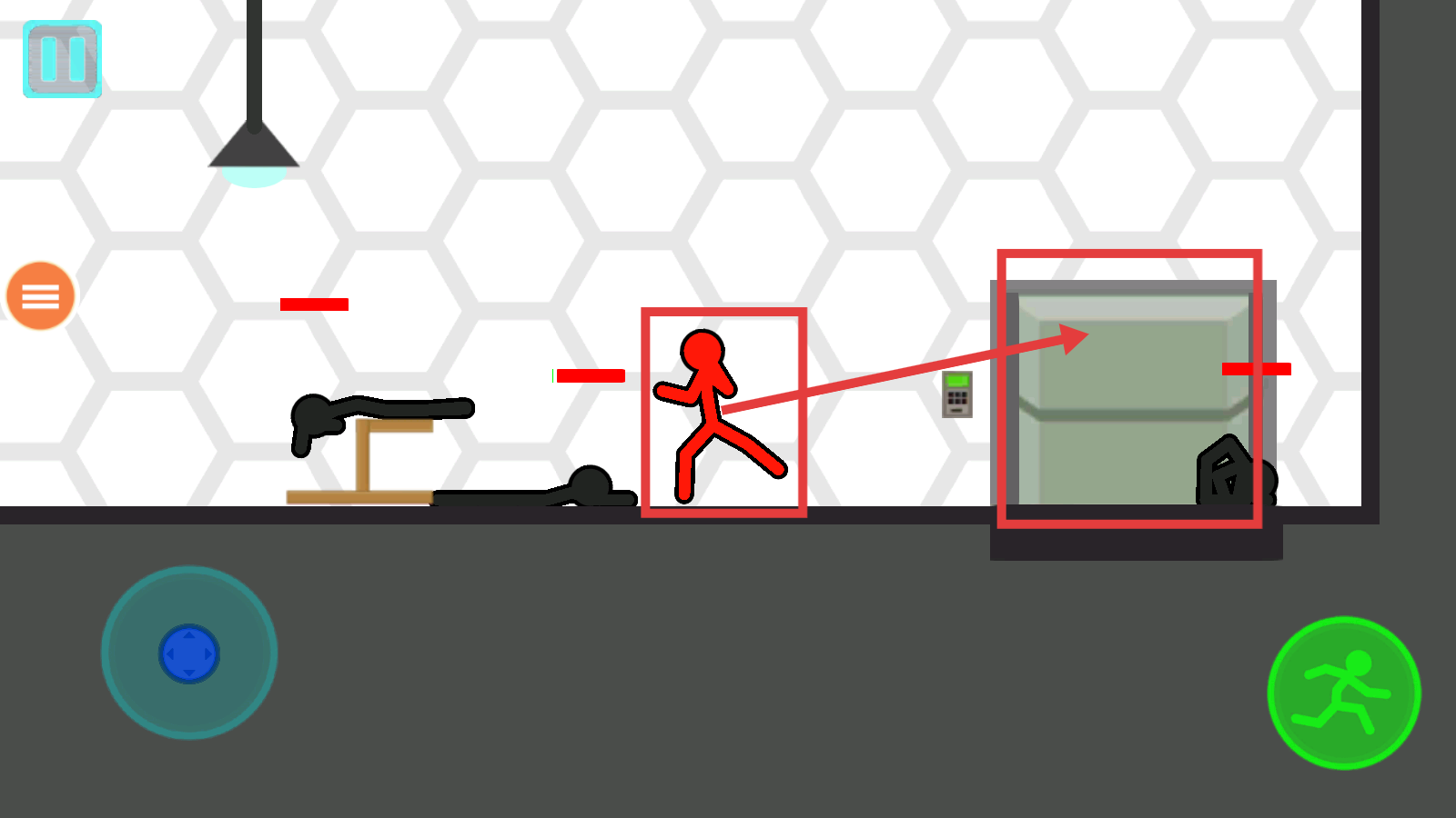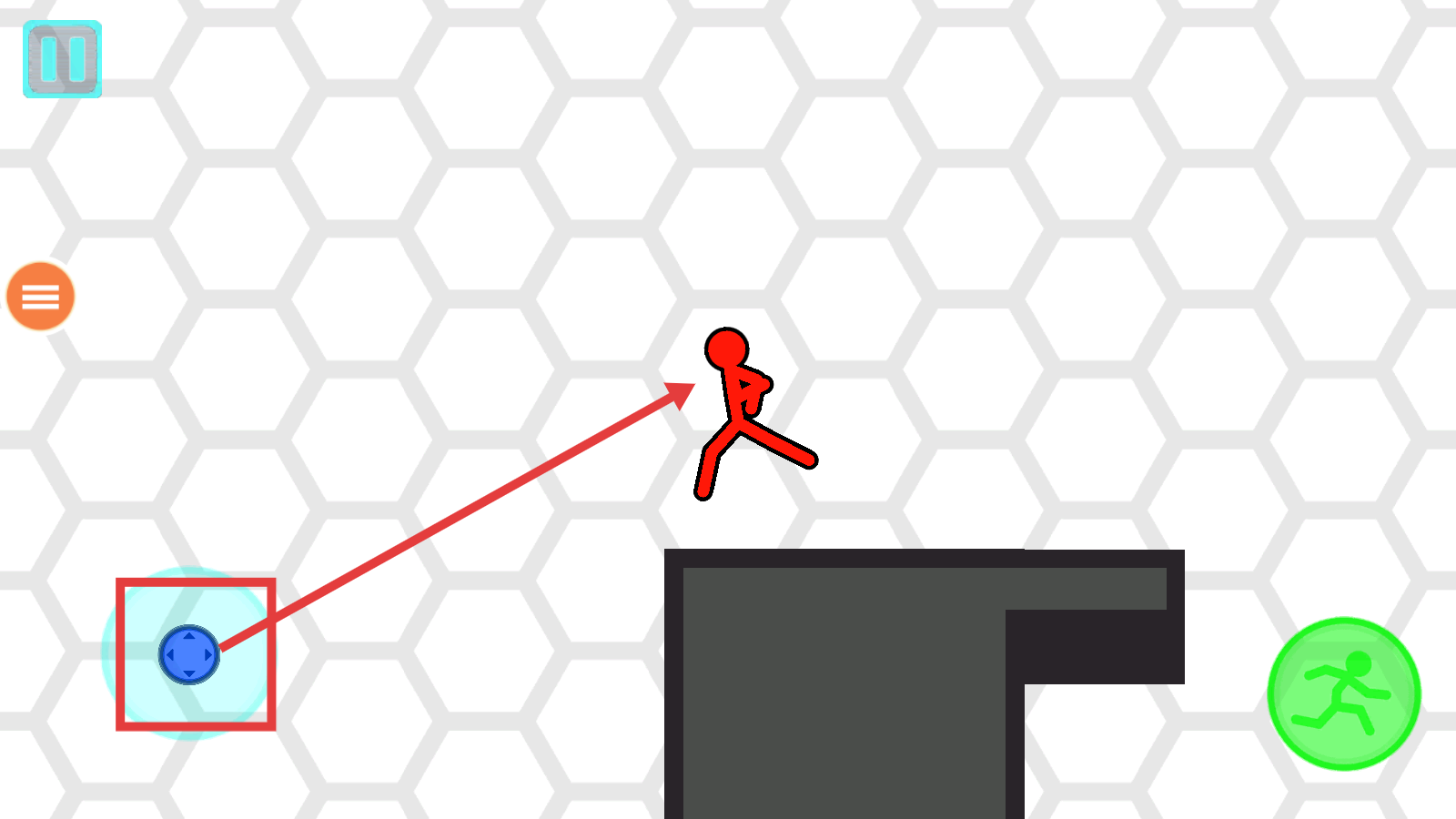 2、冒险中操控左侧蓝色方向按钮,控制红色火柴人上下左右移动,朝着目标区域前进。