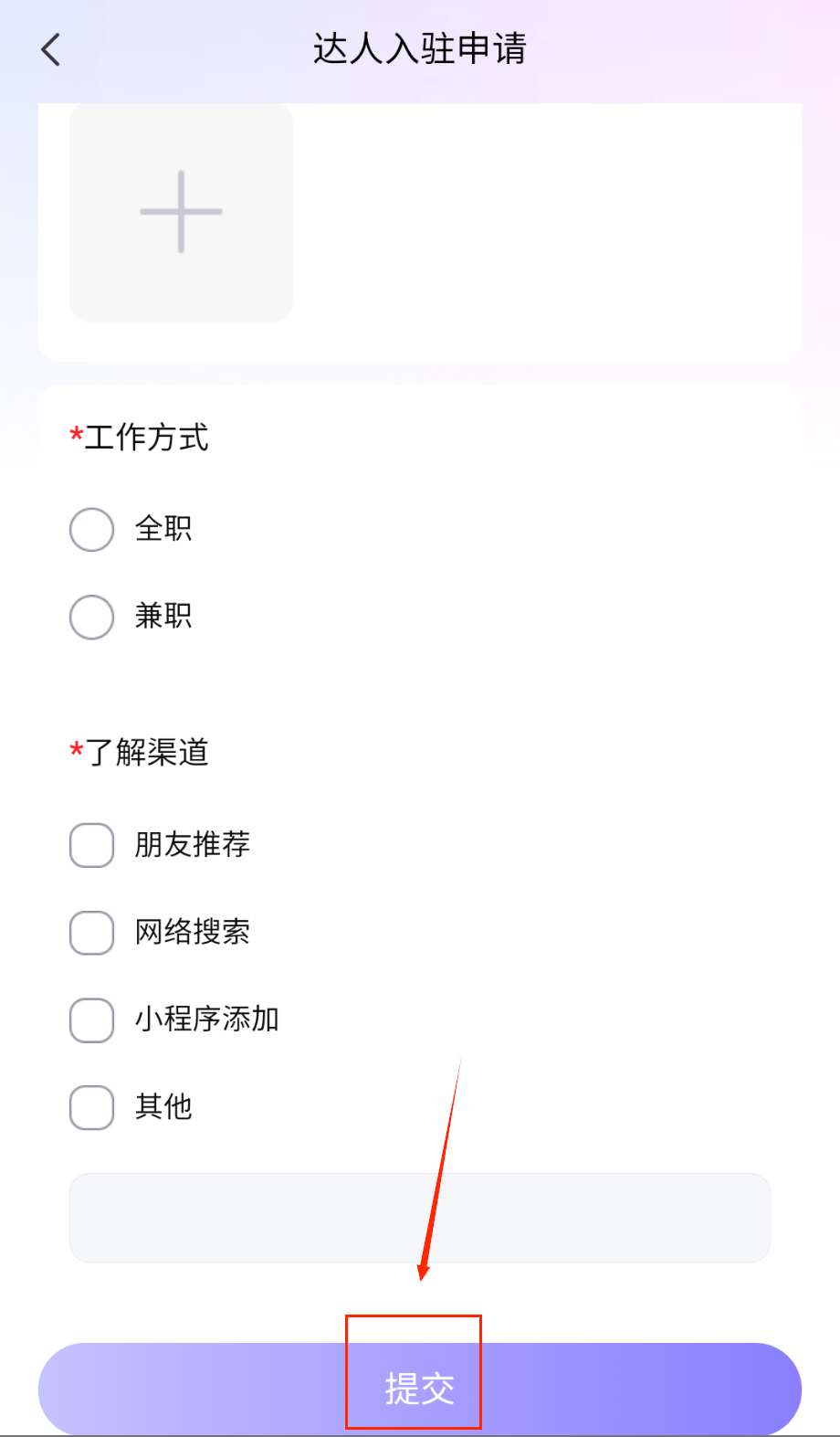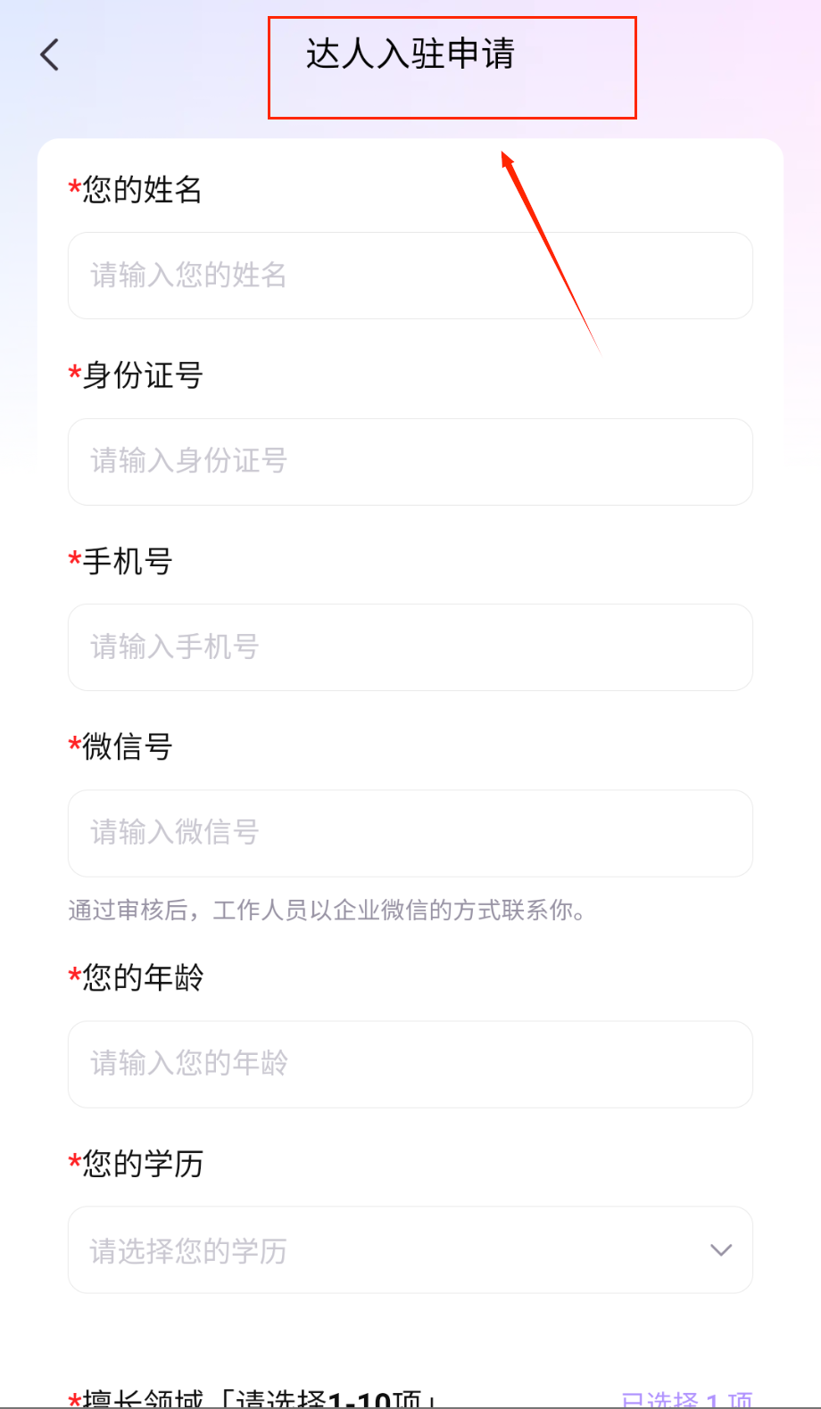 1、首先打开软件进入达人入驻申请页面,能看到顶部显示"达人入驻申请",下方有个输入框提示"需要填写平台名称"。