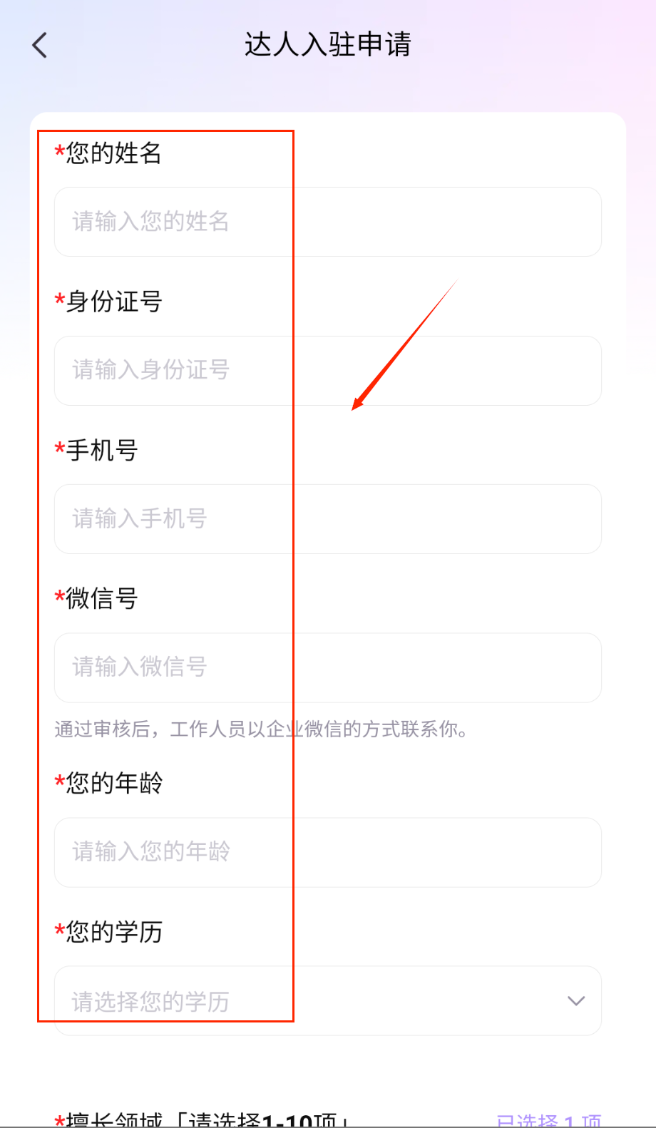 3、基础信息部分需要填写姓名、身份证号、手机号等必填内容,年龄和学历栏需如实填写,擅长领域部分最多可选择10个项目。