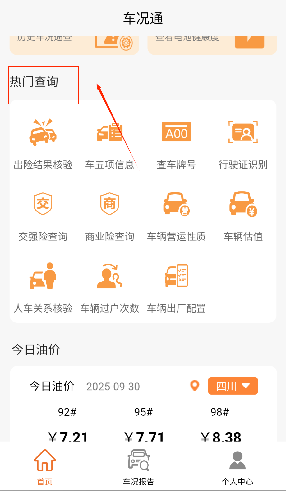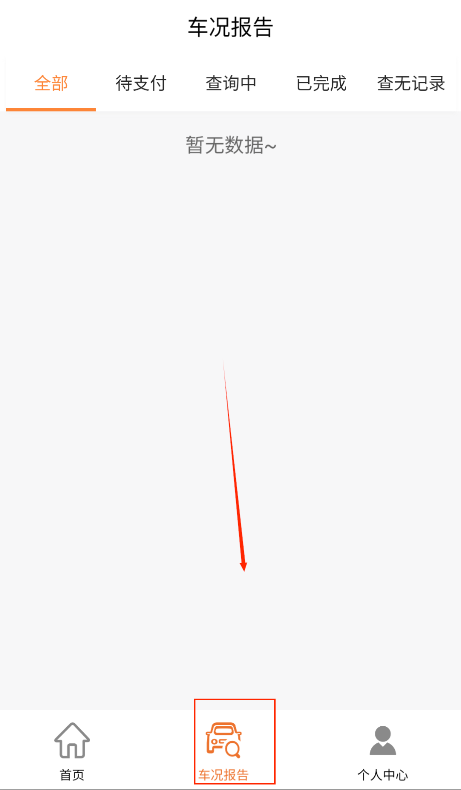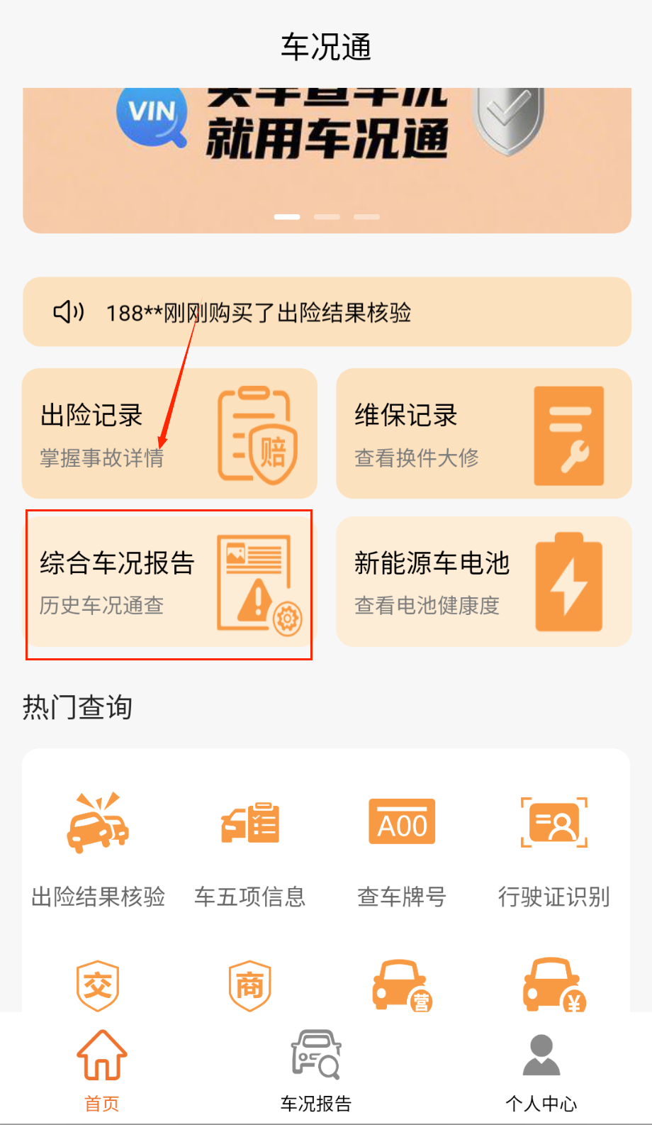 1、打开车况通app并进入查询界面,输入待查车辆的车架号等信息,系统将自动调取该车的出险、维保、投保和过户记录。