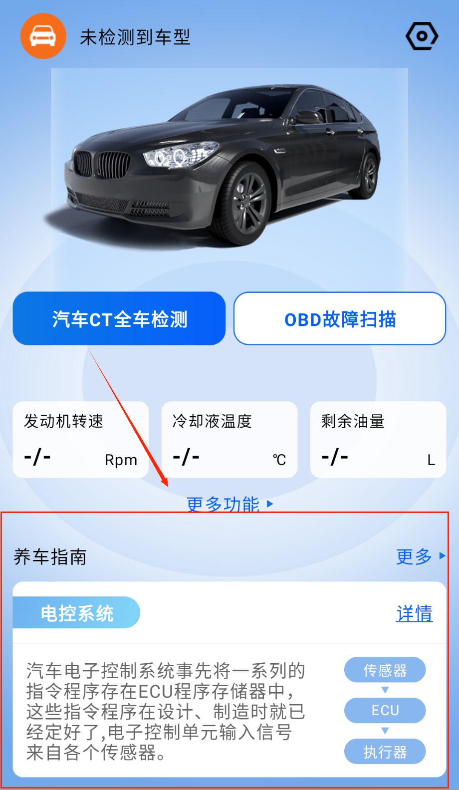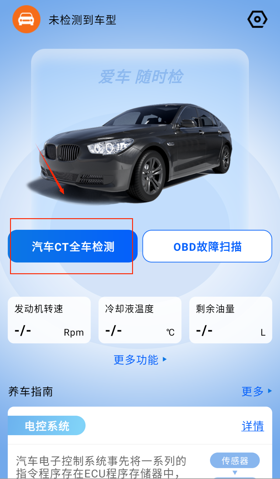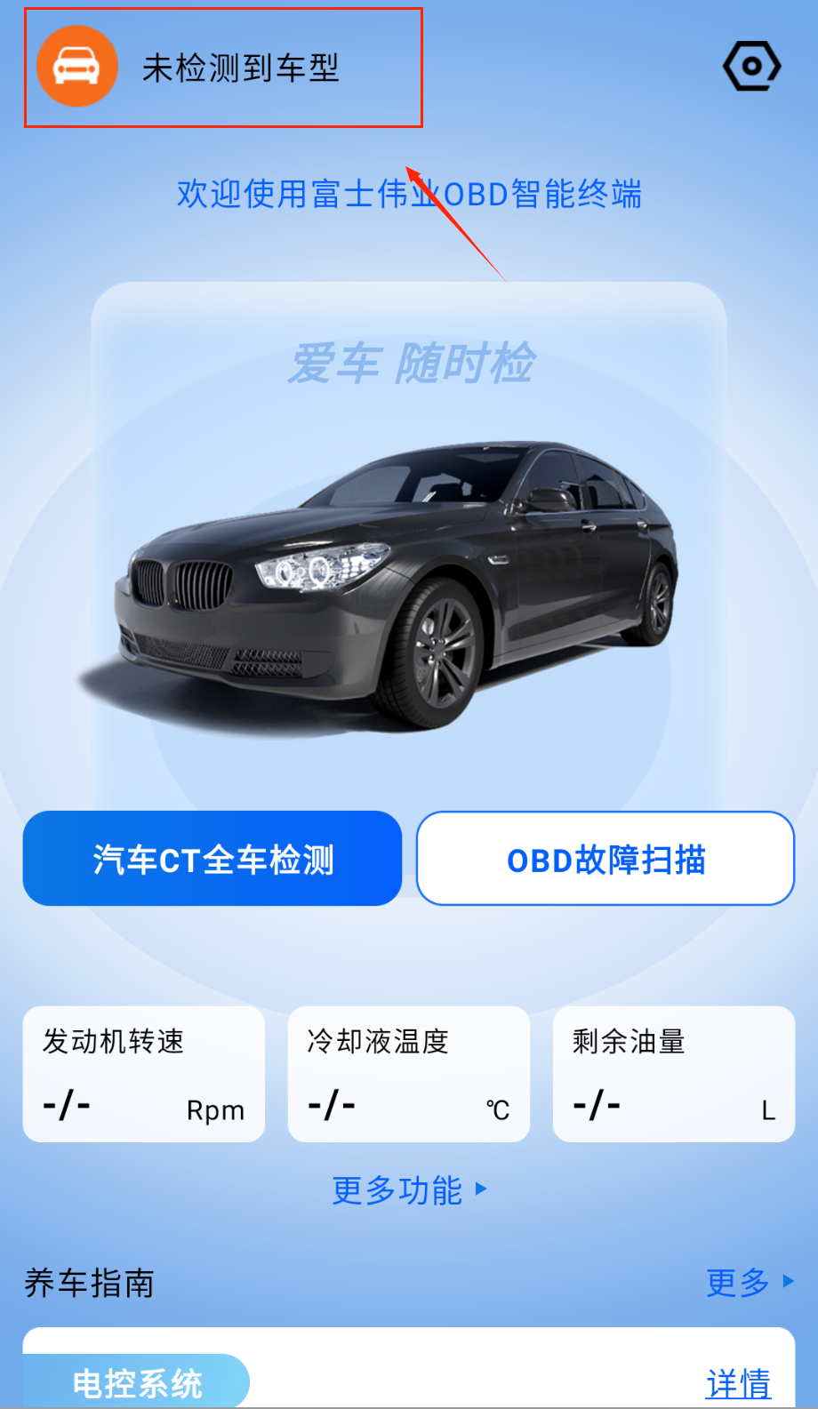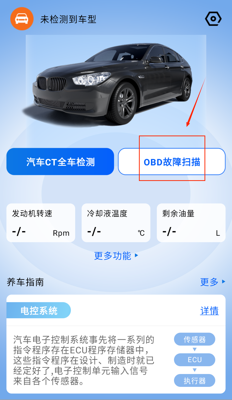 1、启动应用后通过蓝牙功能连接移动终端,与车载设备建立稳定通信渠道,实现数据实时交互为后续检测提供基础支持。