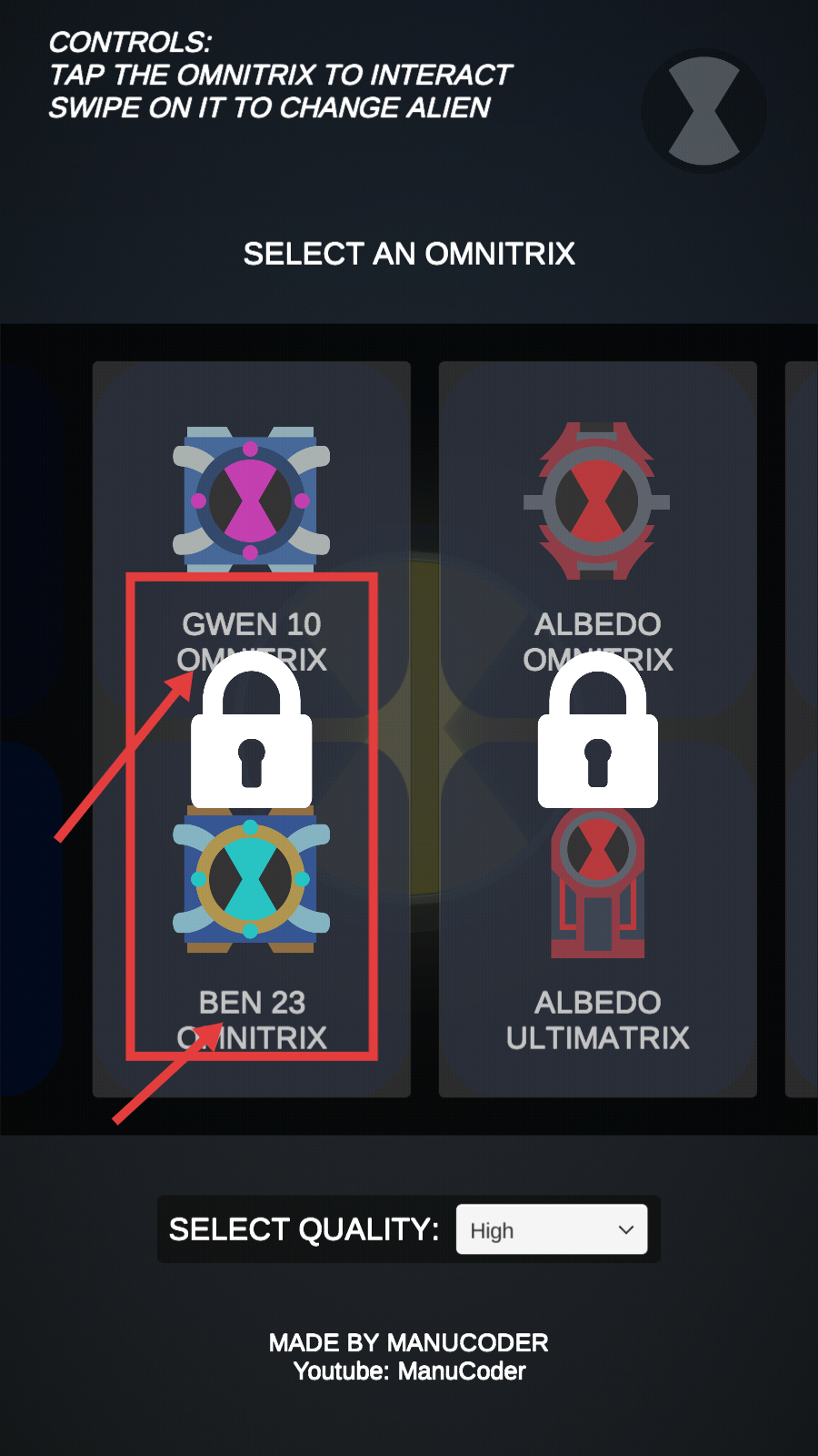 4、注意【GWEN-10-OMNITRIX】和【BEN-23-OMNITRIX】等是锁定的,先用好已选的,推进游戏解锁它们。