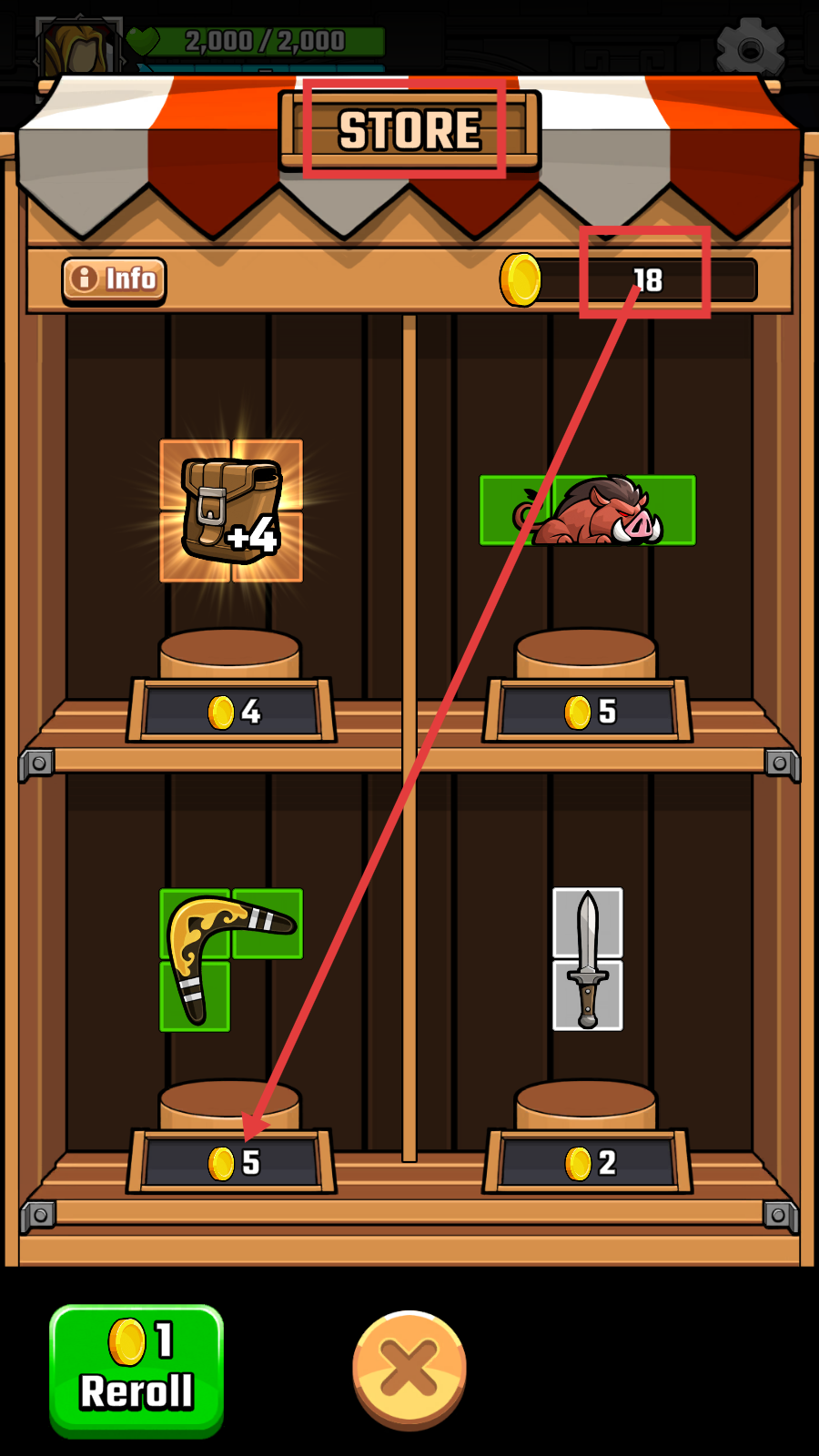 1、在【STORE】商店中,可使用拥有的【18】金币,选购像标价【5】金币的道具,增强冒险实力。