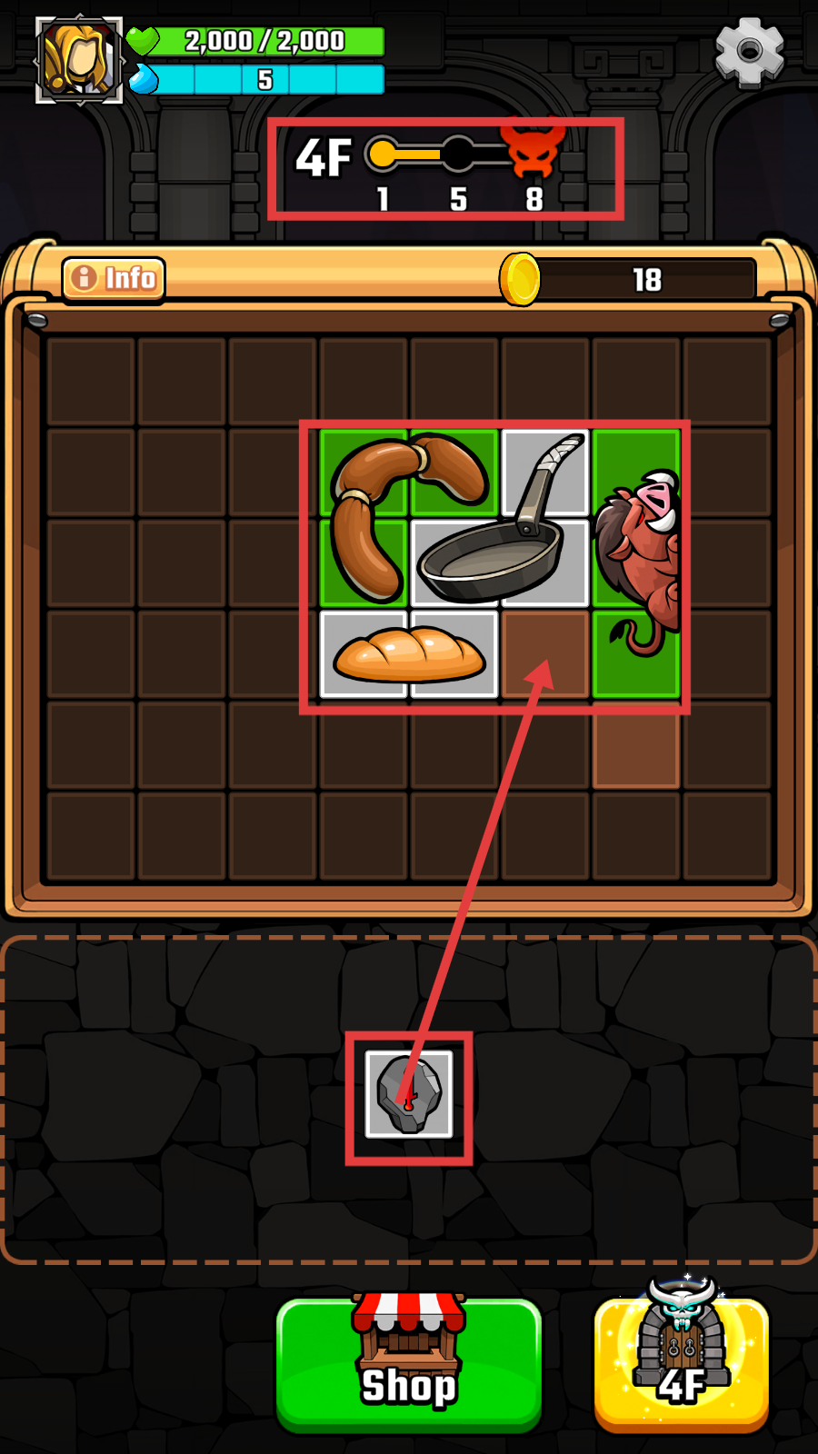 2、进入【4F】楼层后,借助下方的合成类图标,把香肠、平底锅、面包等道具在格子内合理布置,为后续战斗筹备。