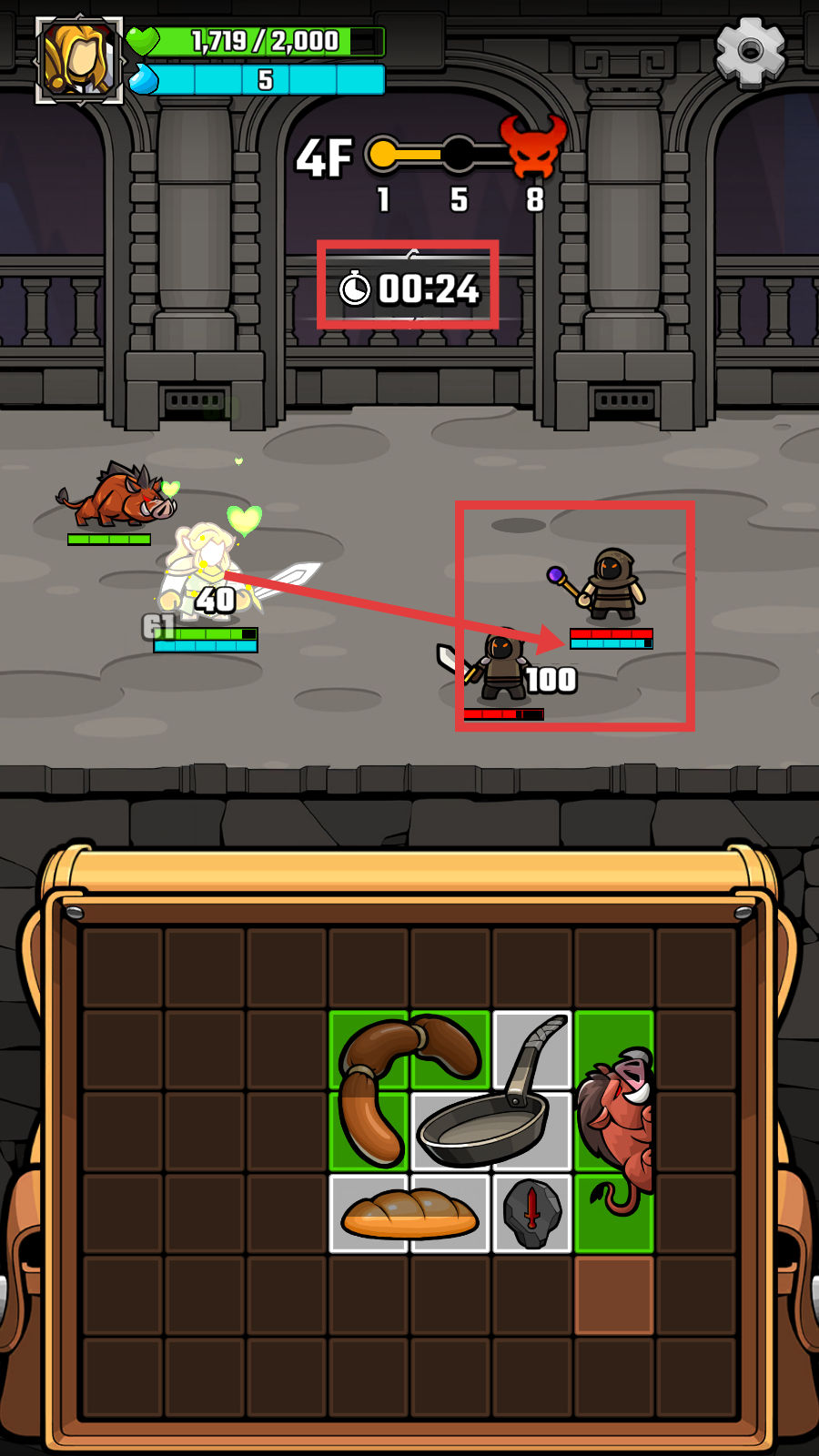 3、在【4F】的战斗场景里,留意上方的计时【00:24】,应对血量为【100】等的敌人,及时进行伤害输出。