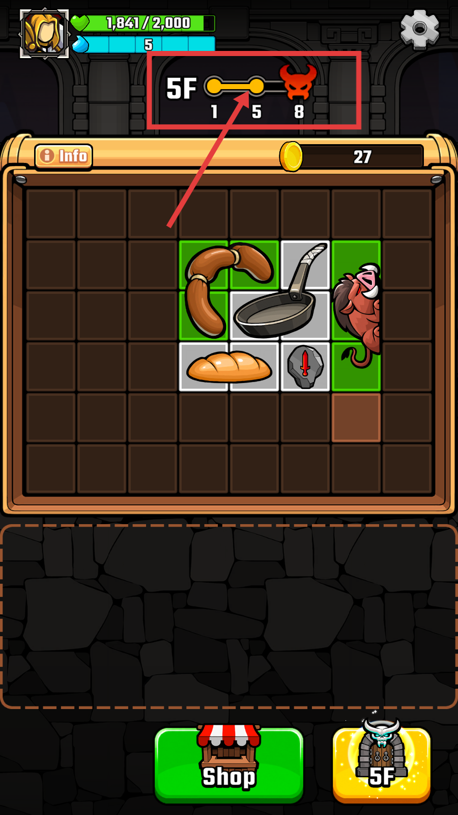 4、顺利通过【4F】后,会推进到【5F】楼层,此时金币变为【27】,可继续利用格子内的道具挑战难度更高的关卡。