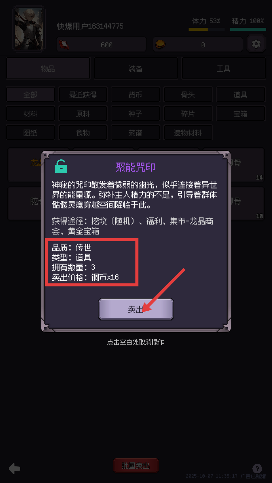 4、获得的【聚能咒印】品质为传世,类型是道具,拥有数量够时,可点击【卖出】换得铜币×16。