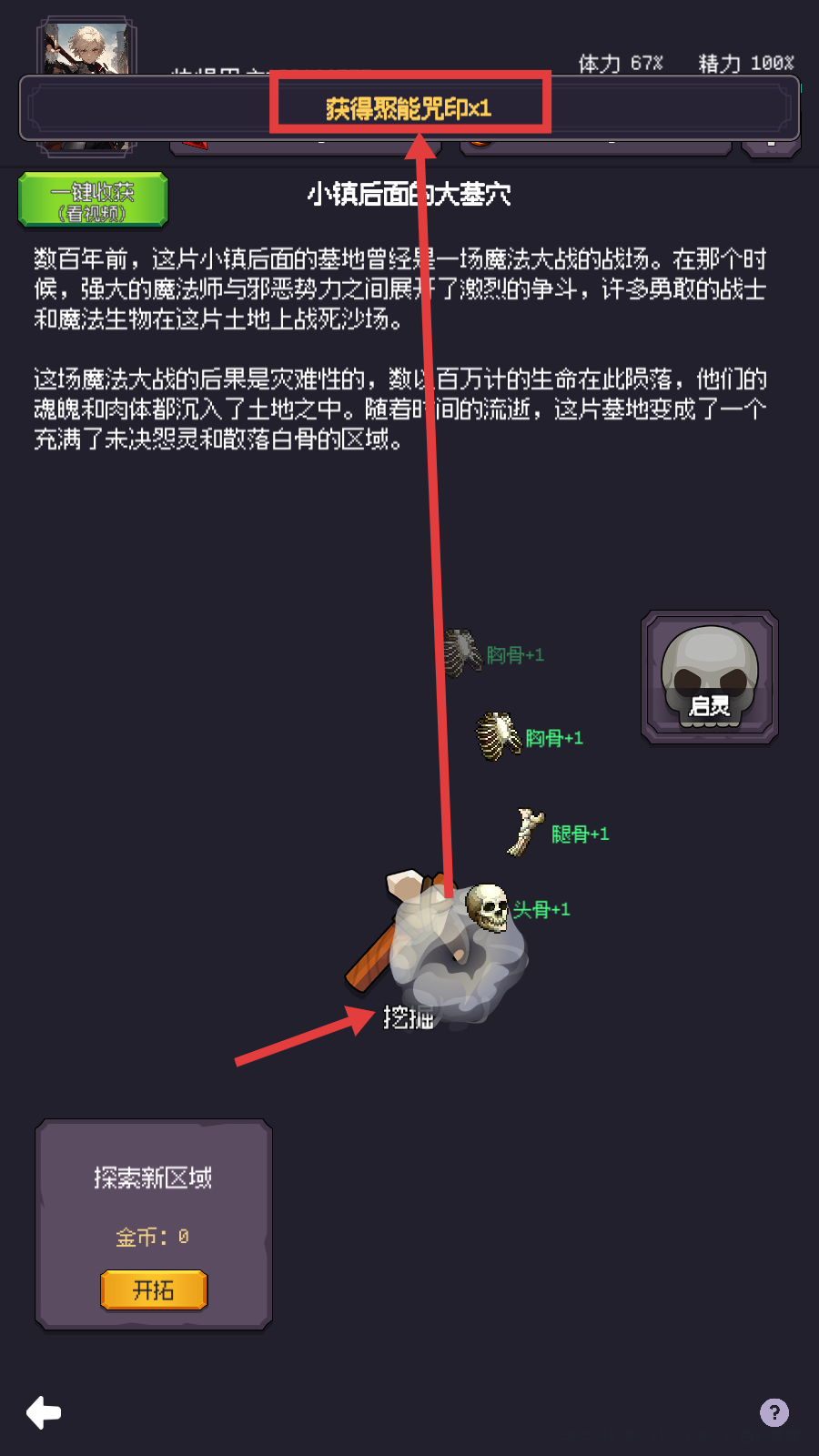 3、进入“小镇后面的大墓穴”场景,点击【挖掘】,可获取胸骨、腿骨等,还有概率获得【聚能咒印×1】。