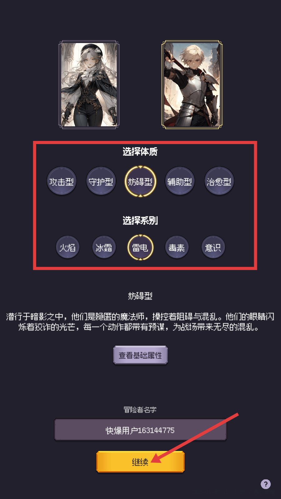2、在角色创建界面,选择【妨碍型】体质与【雷电】系别,确认后点击【继续】,推进角色创建流程。